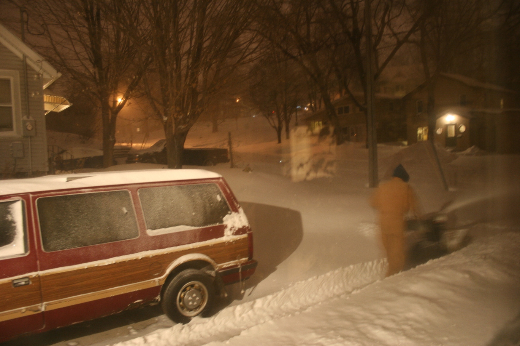 Once we’d finished our snow removal assignments, Randy and I worked on clearing the driveway of snow down to the concrete. Part of the front metal scraper is broken off our aged snowblower, meaning a layer of snow now remains. Thursday evening I used the wide metal shovel and Randy the plastic one as we attempted to get under the snow and peel it away. Sometimes that approach worked well, sometimes not.