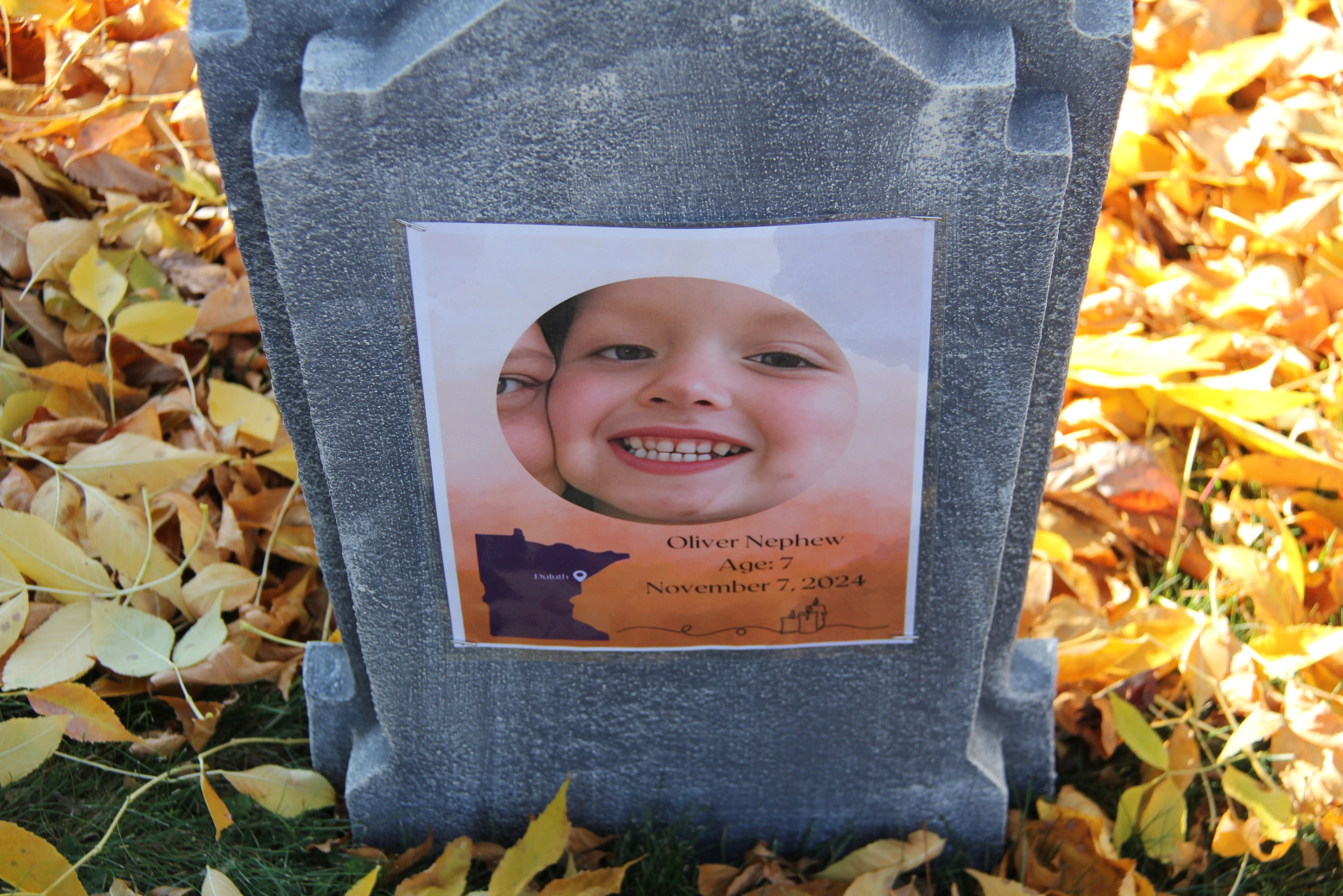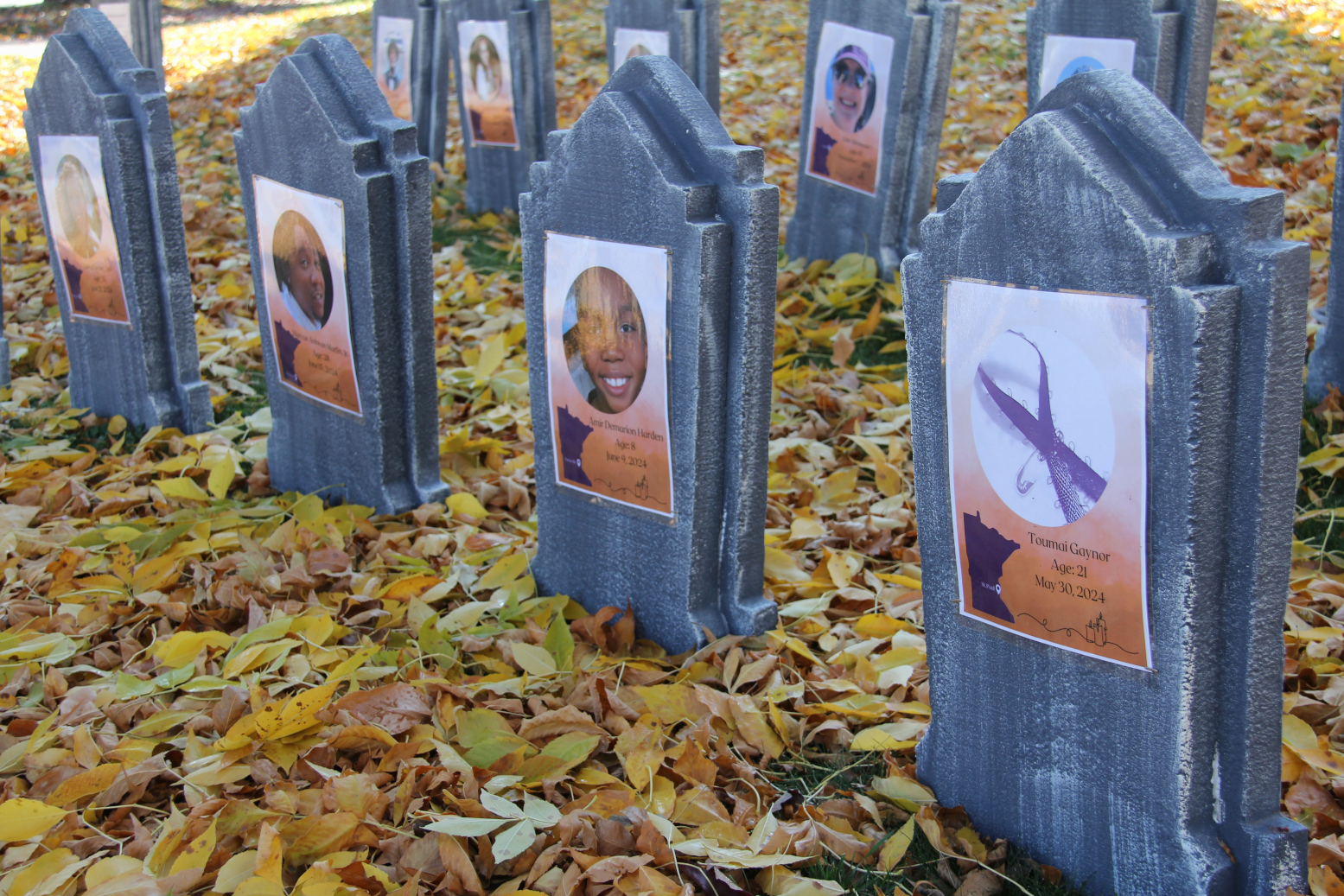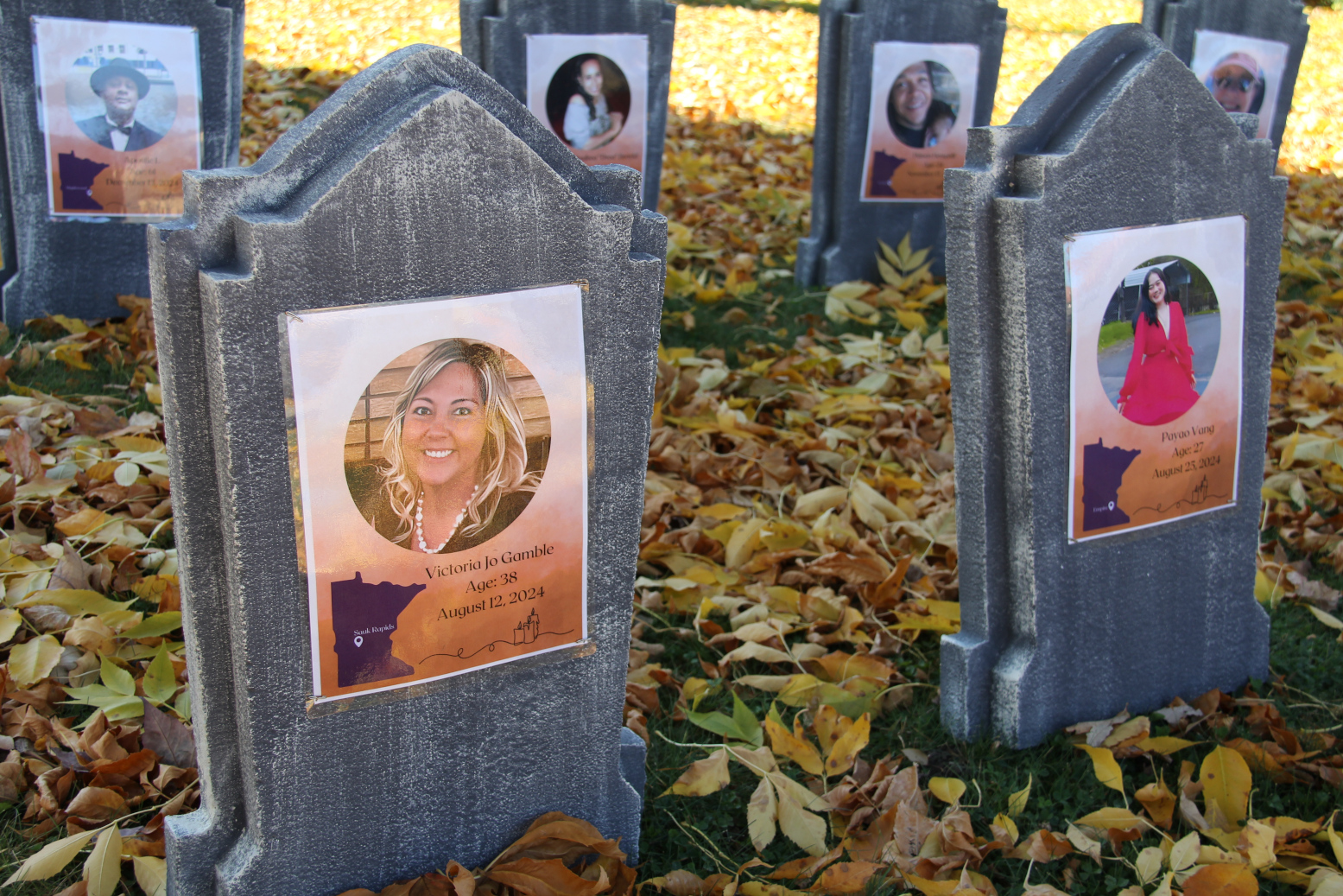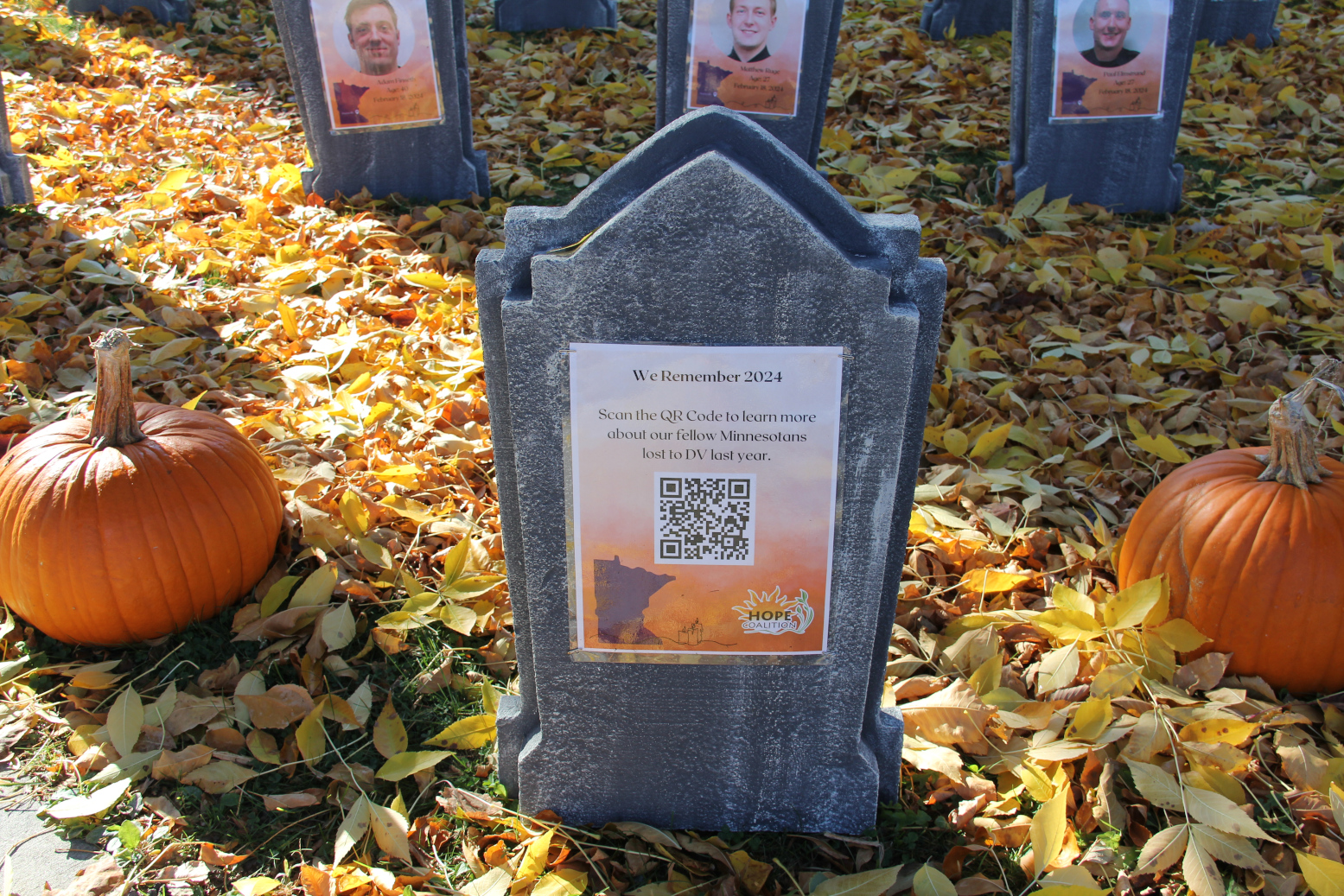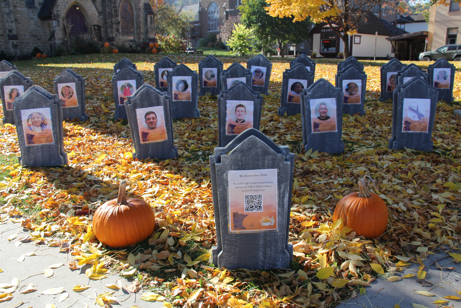 And then, just up the street across from the public library and a small park, I noticed rows of fake tombstones placed upon a corner of the Christ Episcopal Church yard. From a distance, I thought this to be part of a Halloween display. But when I got closer, I realized I was looking at something far scarier. This was a memorial to the 24 Minnesotans who died as a result of domestic violence in 2024. It also honors three others whose deaths are called “suspicious,” with many details yet unknown, but enough to be included in the Violence Free Minnesota “We Remember 2024 Report.”