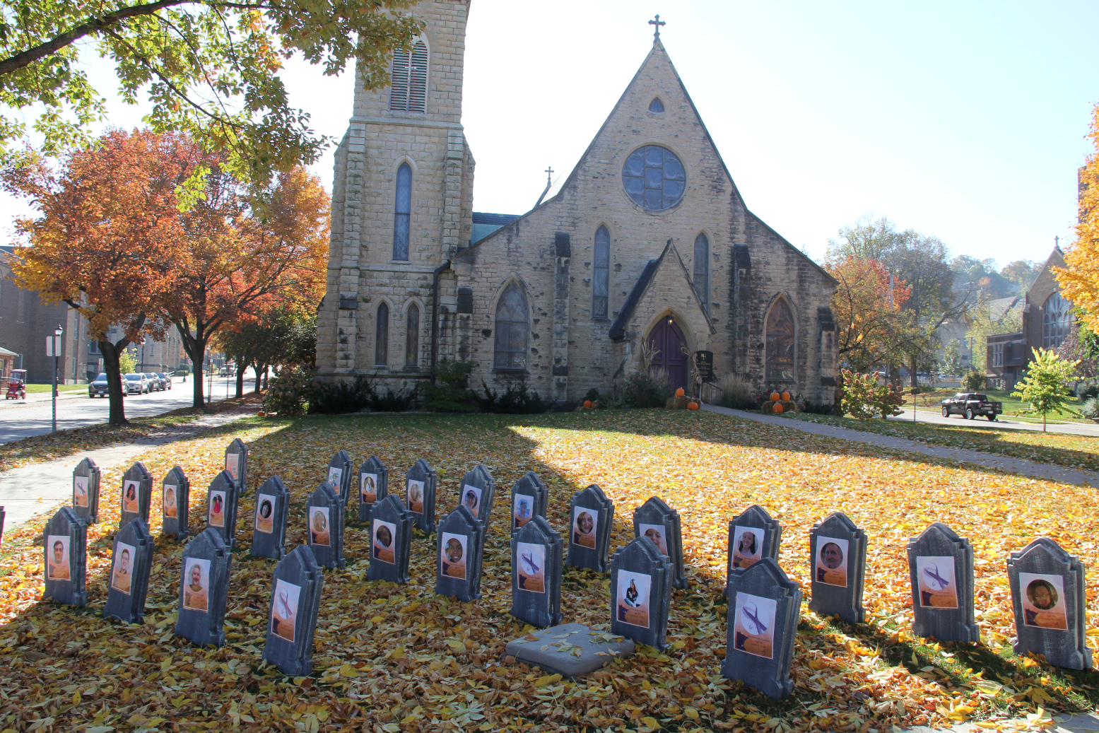 Hope Coalition, an advocacy and support organization for domestic abuse survivors and their families in Goodhue and Wabasha counties, placed this temporary graveyard against the backdrop of the impressive 1871 stone church with a mission of “Serving God. Serving our Community.”