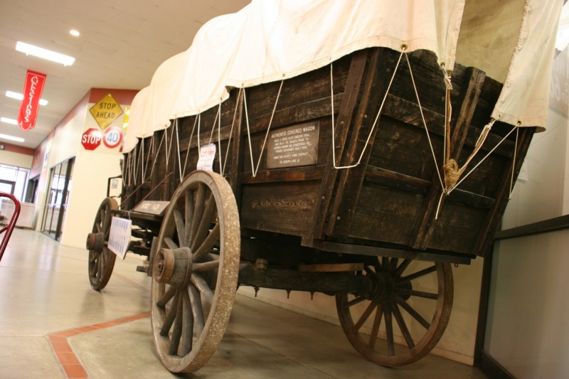 Given our late arrival shortly before closing on a Saturday afternoon, Randy and I had minimal time to poke around. And I spent some of that precious shopping time focused on the Conestoga wagon. Signage reveals the wagon traveled four times along the Oregon Trail and was used on the set of the TV western “Wagon Train.” That series ran from 1957 – 1965.
