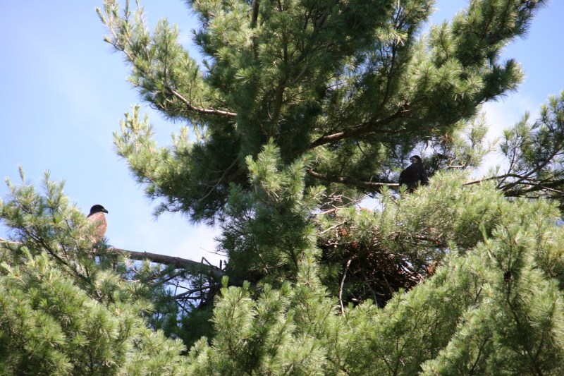 The two juvenile bald eagles, one born last year, the other this year. One is clearly visible to the left. The other is higher in the tree to the right.