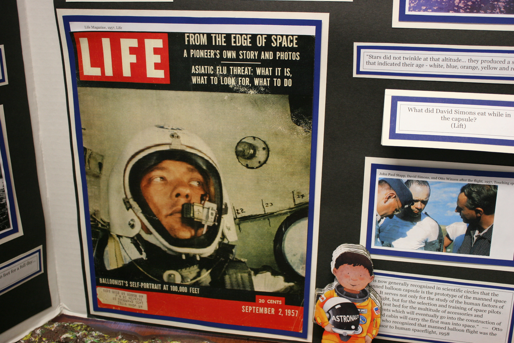 The story of MAN HIGH II truly impresses me, especially after seeing the small size of the replica capsule and feeling the thinness of the helium balloon. (The actual capsule is displayed at the National Museum of the US Air Force in Dayton, Ohio.) Simons was one brave man to confine himself inside that tight space for 44 hours. He was sealed in well before arriving at the iron mine pit from South Saint Paul. Claustrophobia got the best of another candidate. I would feel the same. Simons endured much—lack of sleep, extreme temperatures, uncertain weather, and the very real fear that he could die if the thin helium balloon developed even a crack.
