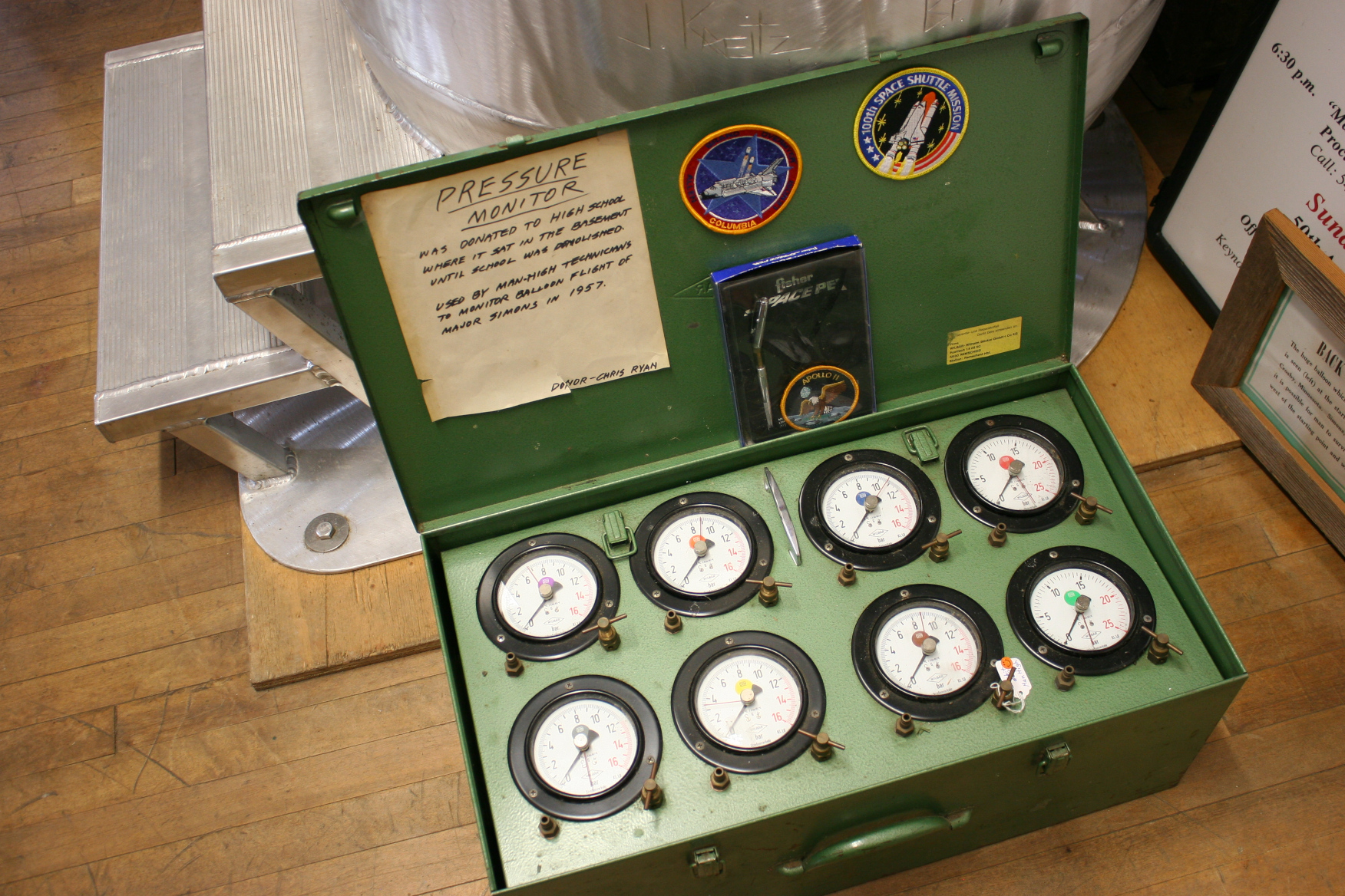 1957 technology: Technicians used this pressure monitor to monitor the MAN HIGH flight. The equipment sat in the basement of the local high school until the school was demolished. Minnesota Prairie Roots photo.