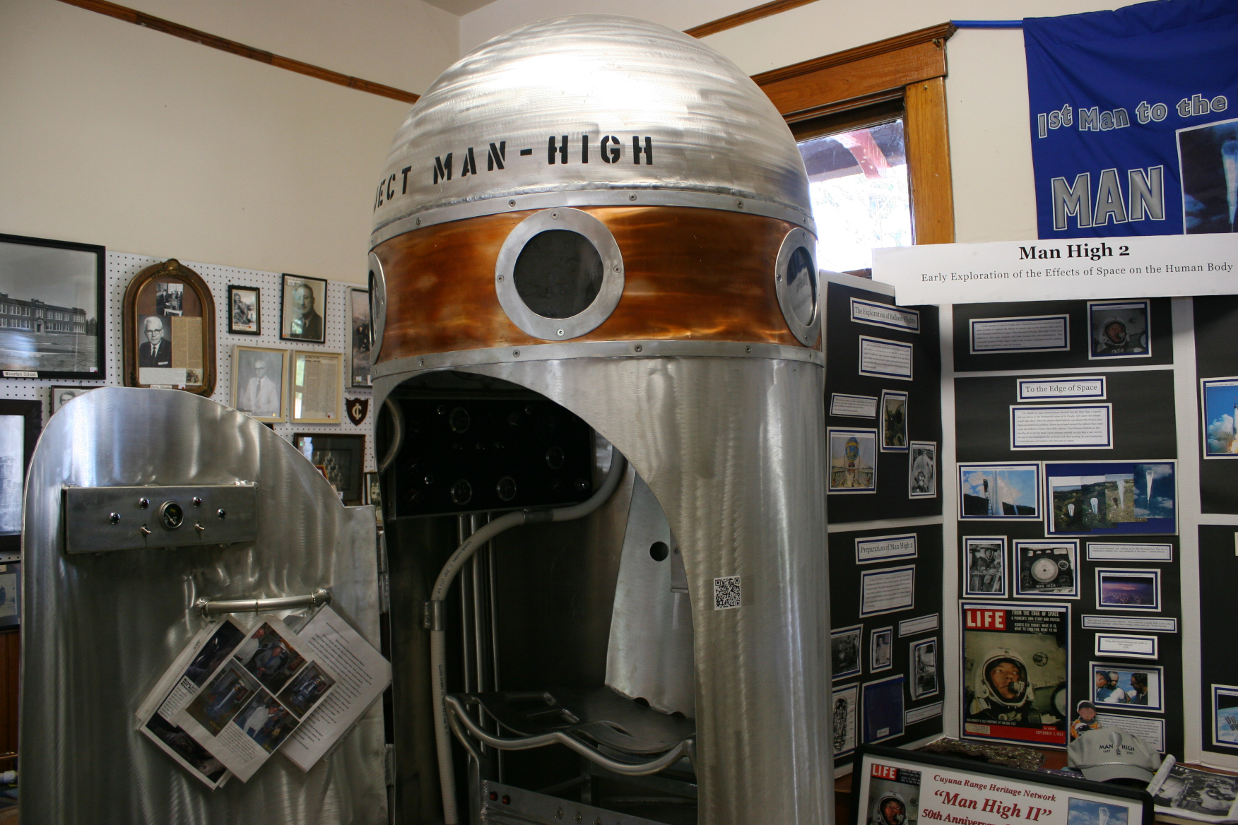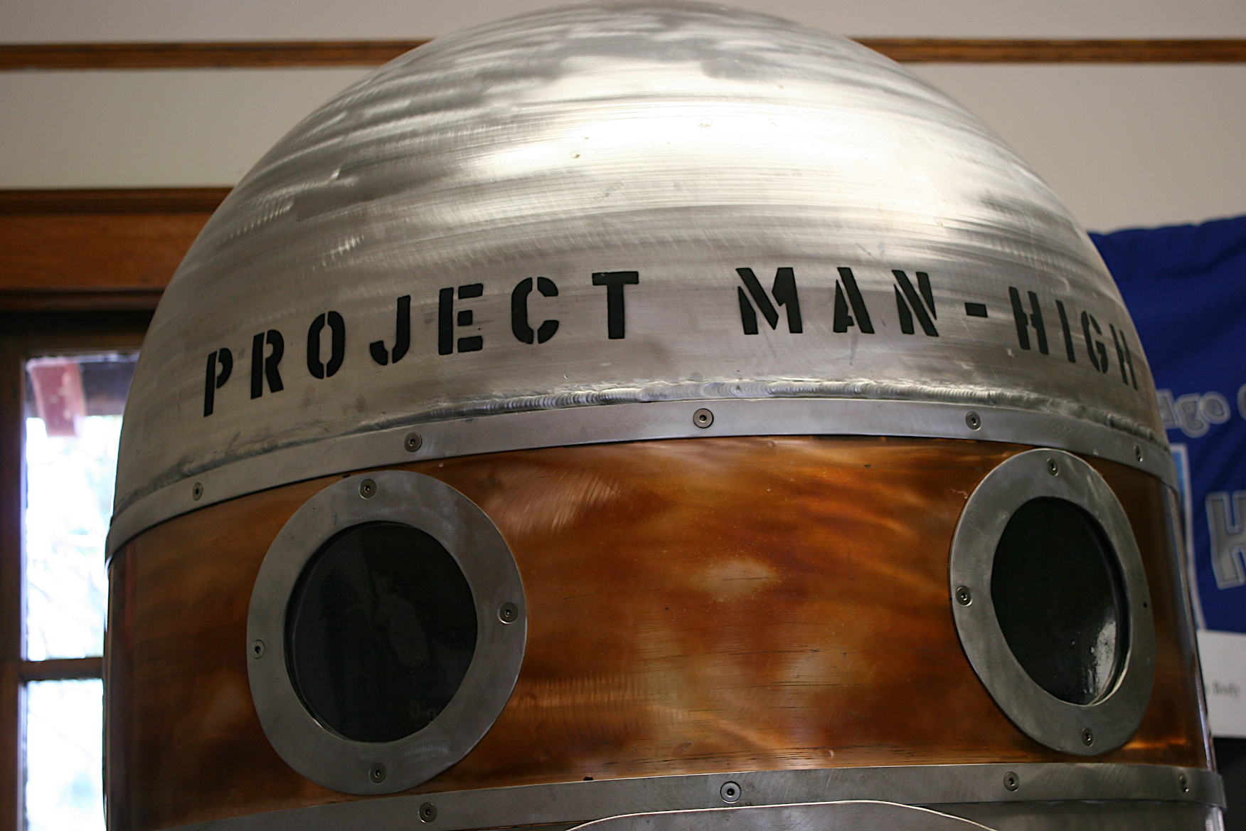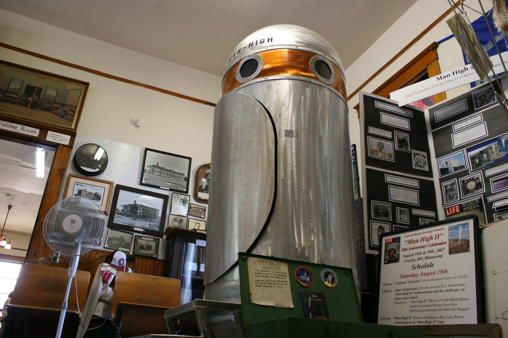 A view of MAN HIGH II, a capsule launched in Minnesota in 1957, laying the groundwork for future space travel. This replica sits in a Crosby, MN., museum. Minnesota Prairie Roots photo.