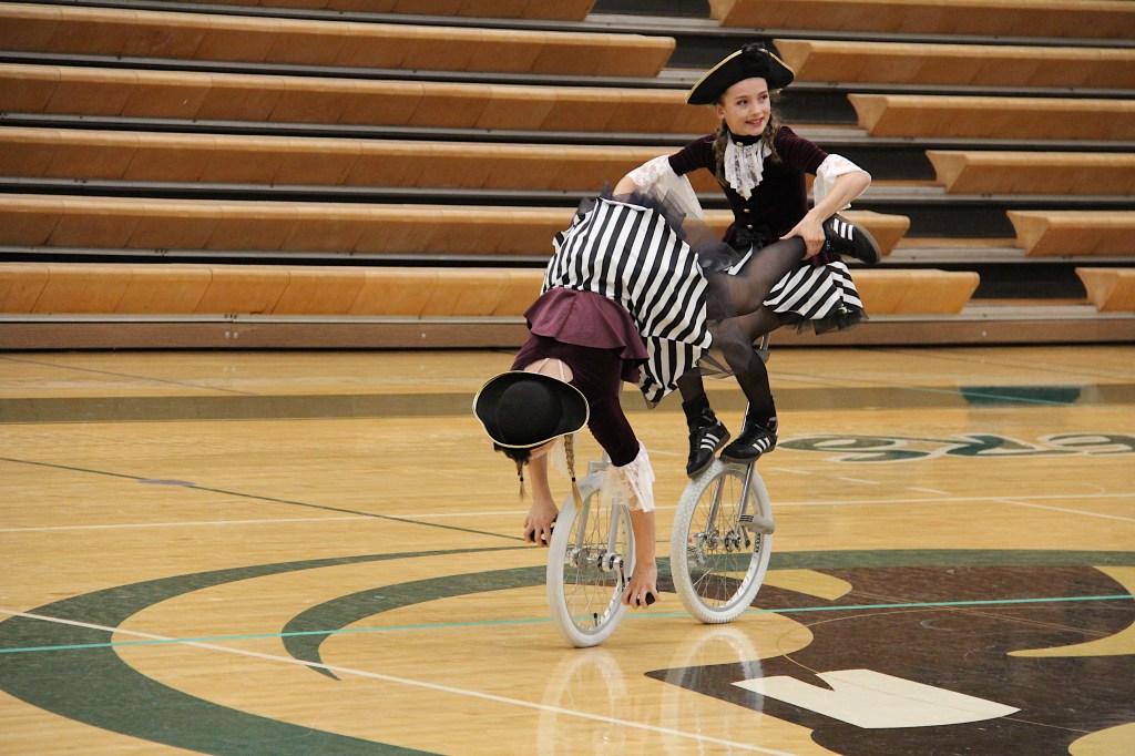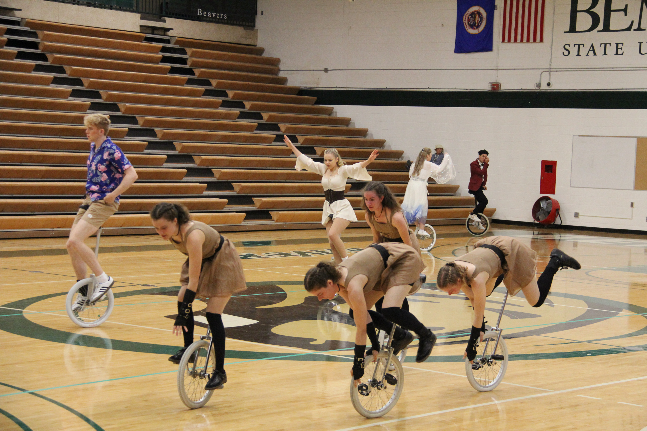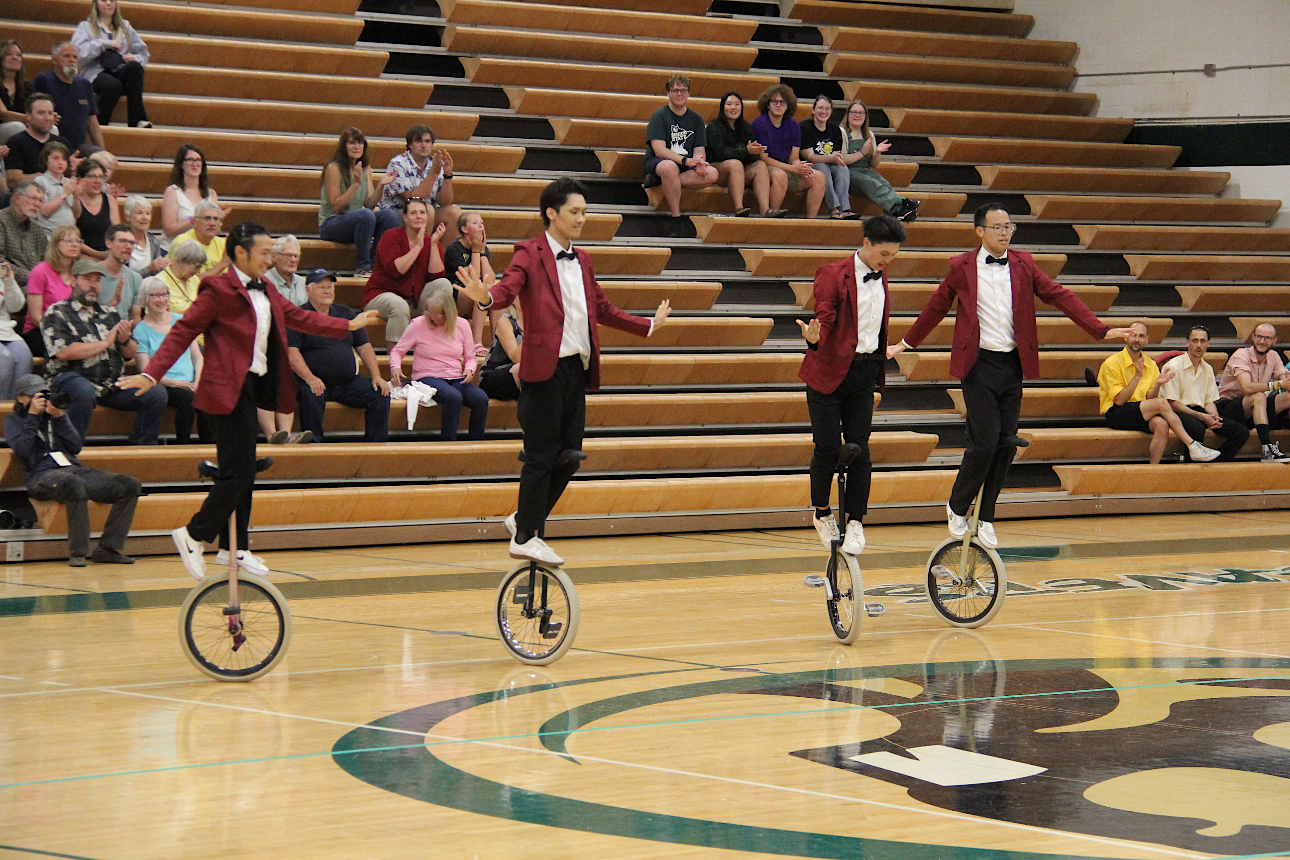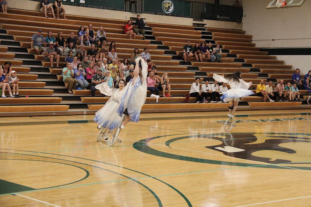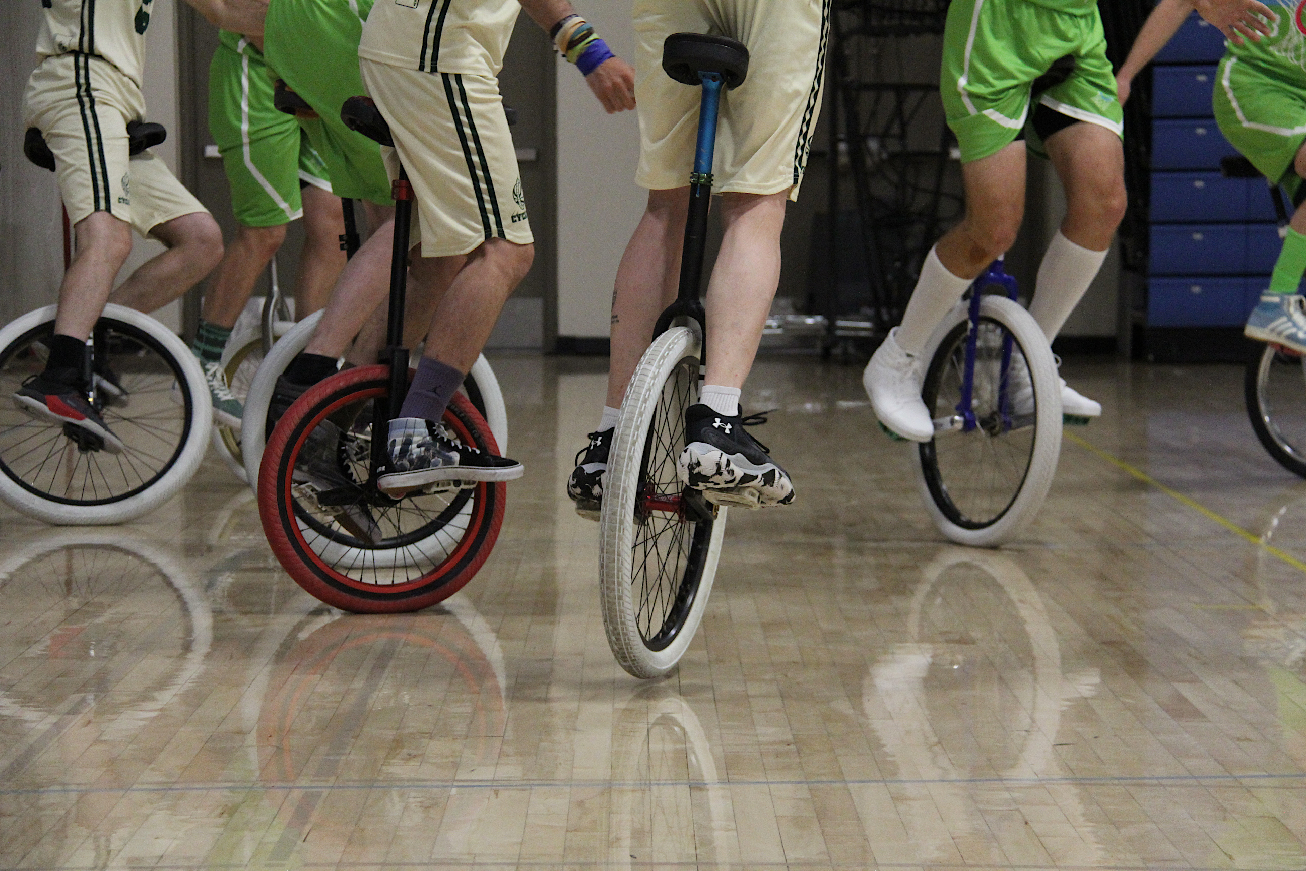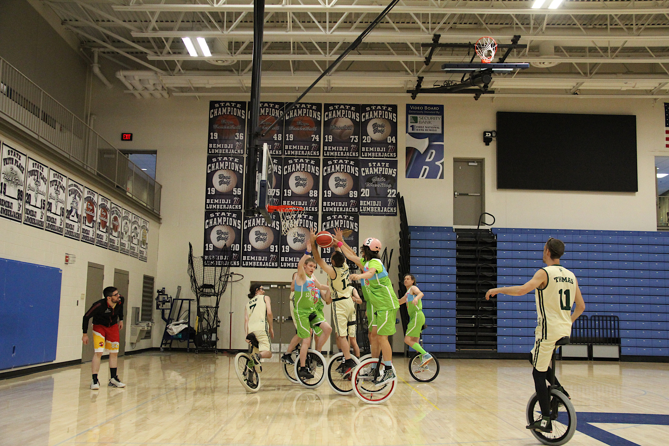 Unicycles were everywhere, including on the basketball court at Bemidji High School. (Minnesota Prairie Roots copyrighted photo July 2024)