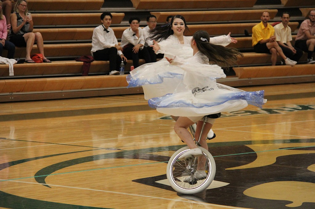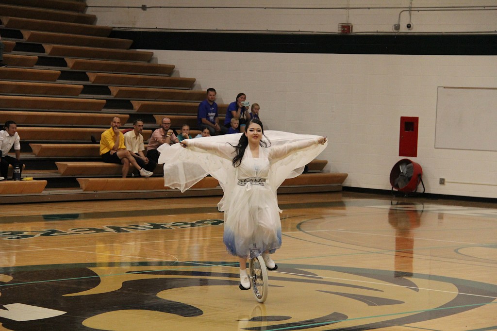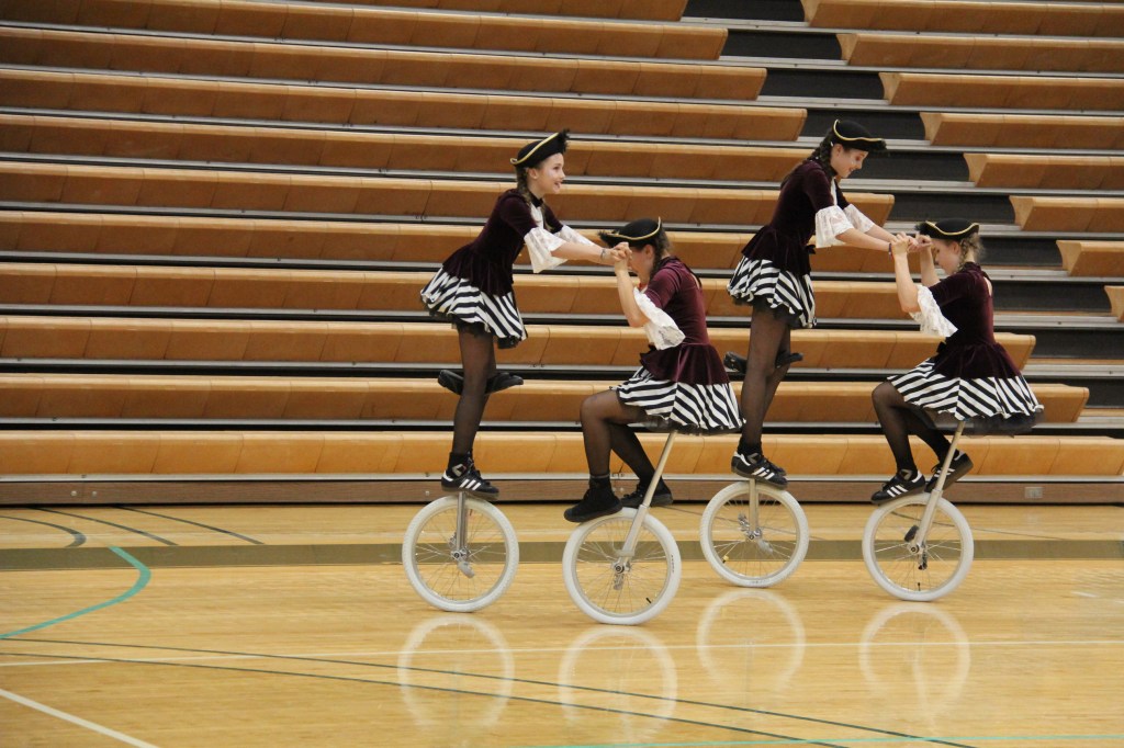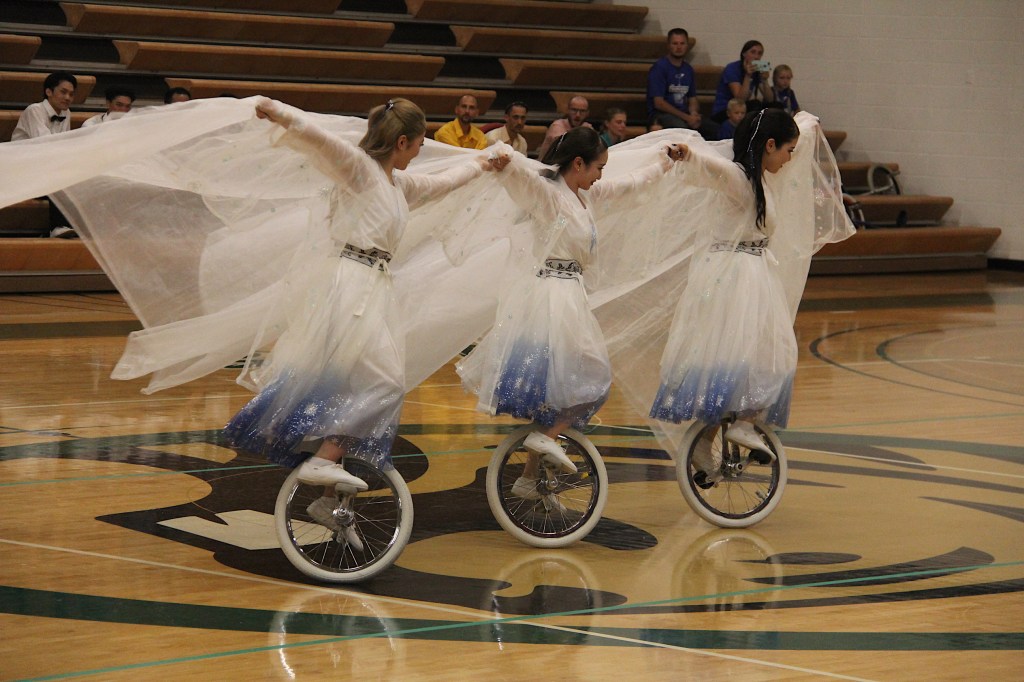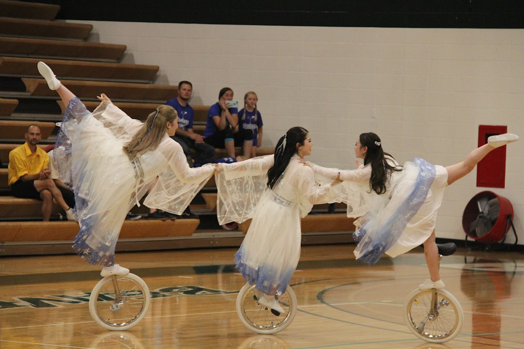 Likewise, UniCircle Flow, also from Japan, was a personal favorite. The three female athletes in gauzy white dresses edged in blue twirled across the gym floor like ballerinas or figure skaters. It was easy to forget they were actually dancing on unicycles rather than on their feet. Their performance flowed with ease and grace, not what I would ever expect while unicycling.