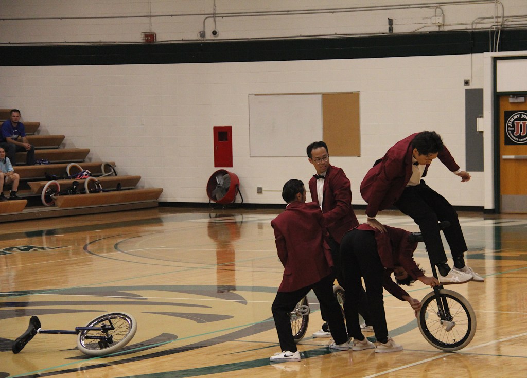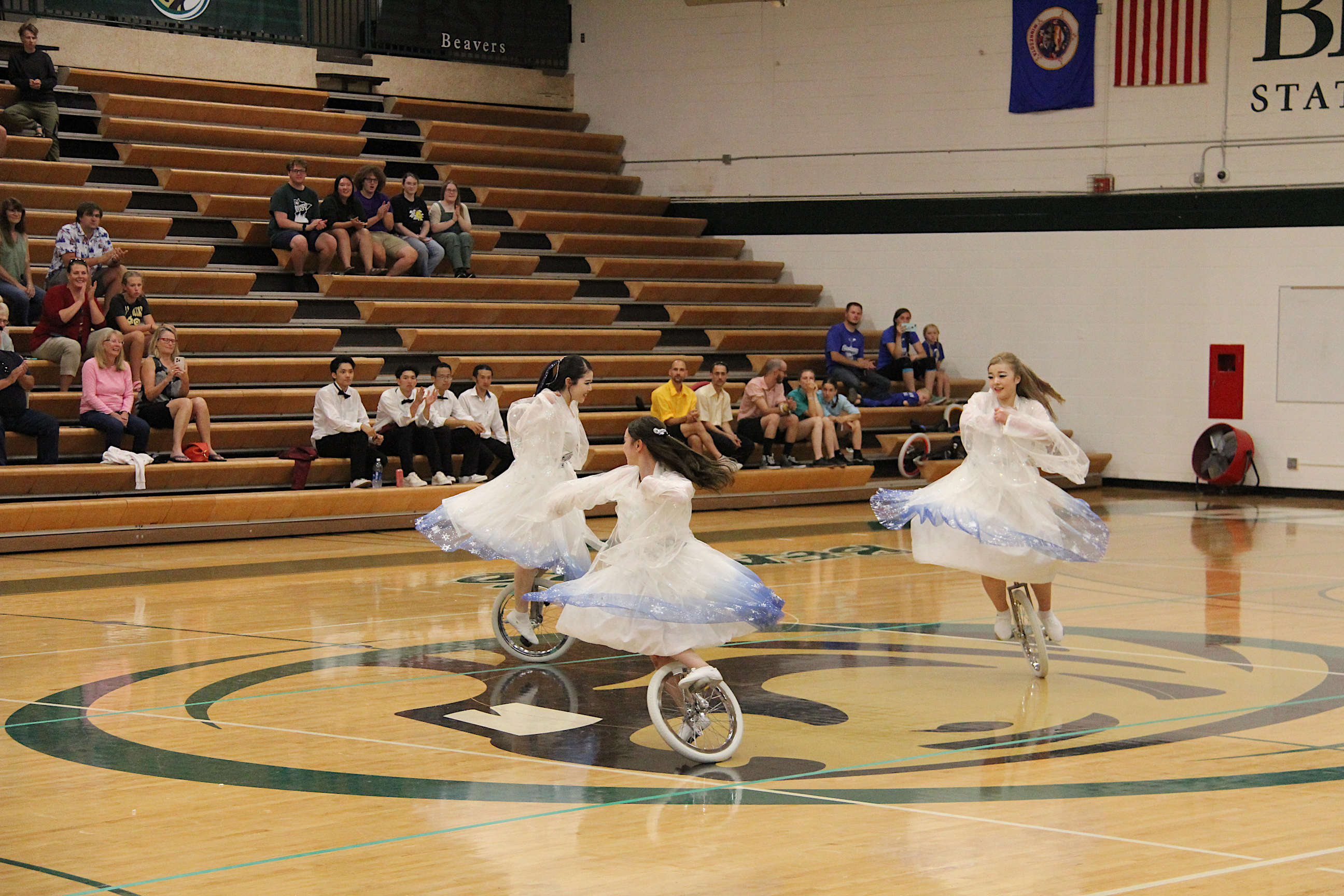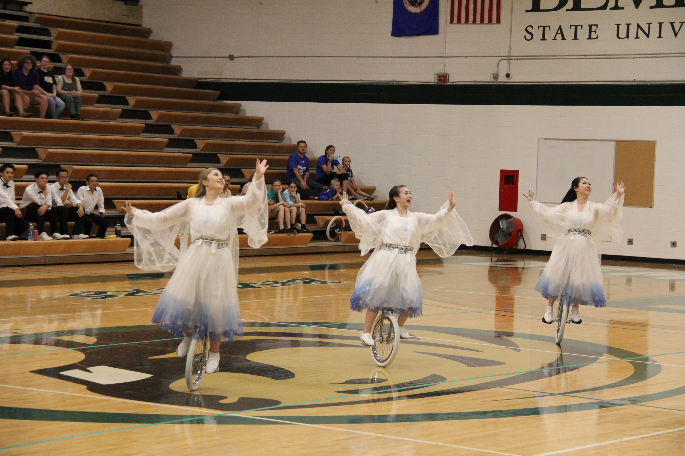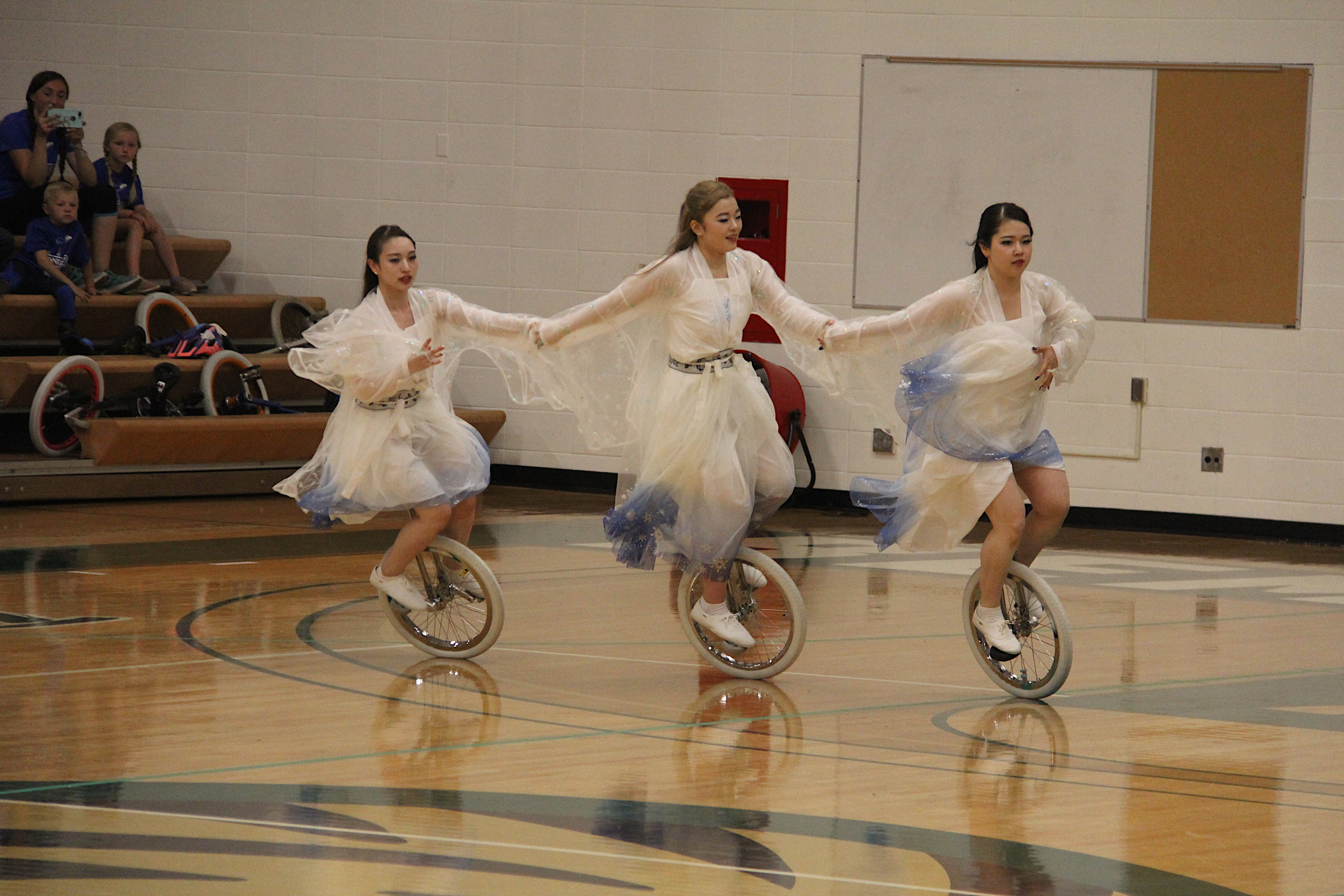 Likewise, UniCircle Flow, also from Japan, was a personal favorite. The three female athletes in gauzy white dresses edged in blue twirled across the gym floor like ballerinas or figure skaters. It was easy to forget they were actually dancing on unicycles rather than on their feet. Their performance flowed with ease and grace, not what I would ever expect while unicycling.