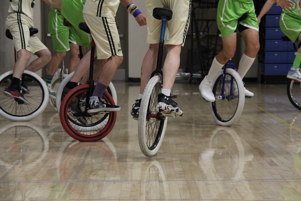 Imagine dribbling and passing a basketball, then shooting a basket all while balancing and rolling and turning on a unicycle. I saw all of that as a team from California played a team from France in the Bemidji High School gym.