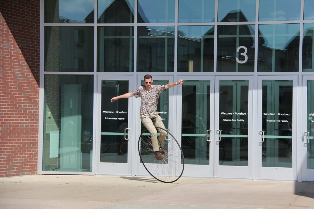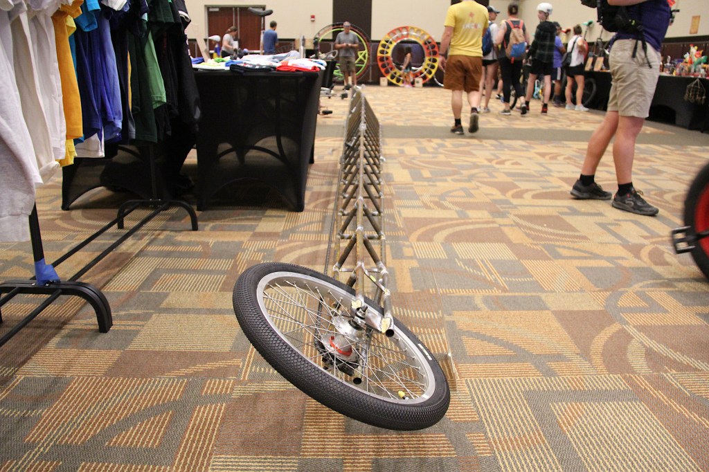 Then it was over to the Sanford Center across town to visit the Unicycle Museum. Unicycles of all ages, sizes and styles ringed the conference room along with unicycle t-shirts, merch and more. Among the unicycles was a 44-foot long custom-made unicycle stretched across the floor. Jamey Mossengren, known as The Unicycling Unicorn, rode the tower-like structure at Unicon 21 in an attempt to break the World Record for Tallest Rideable Unicycle. He failed during his public performance, but achieved his goal during practice, pedaling seven revolutions while in control. I didn’t see his attempt. My son did. As a side note, Mossengren travels around the world performing his unicorn unicycle themed comedy and circus show. He appeared at this year’s Bullhead Days in Waterville.