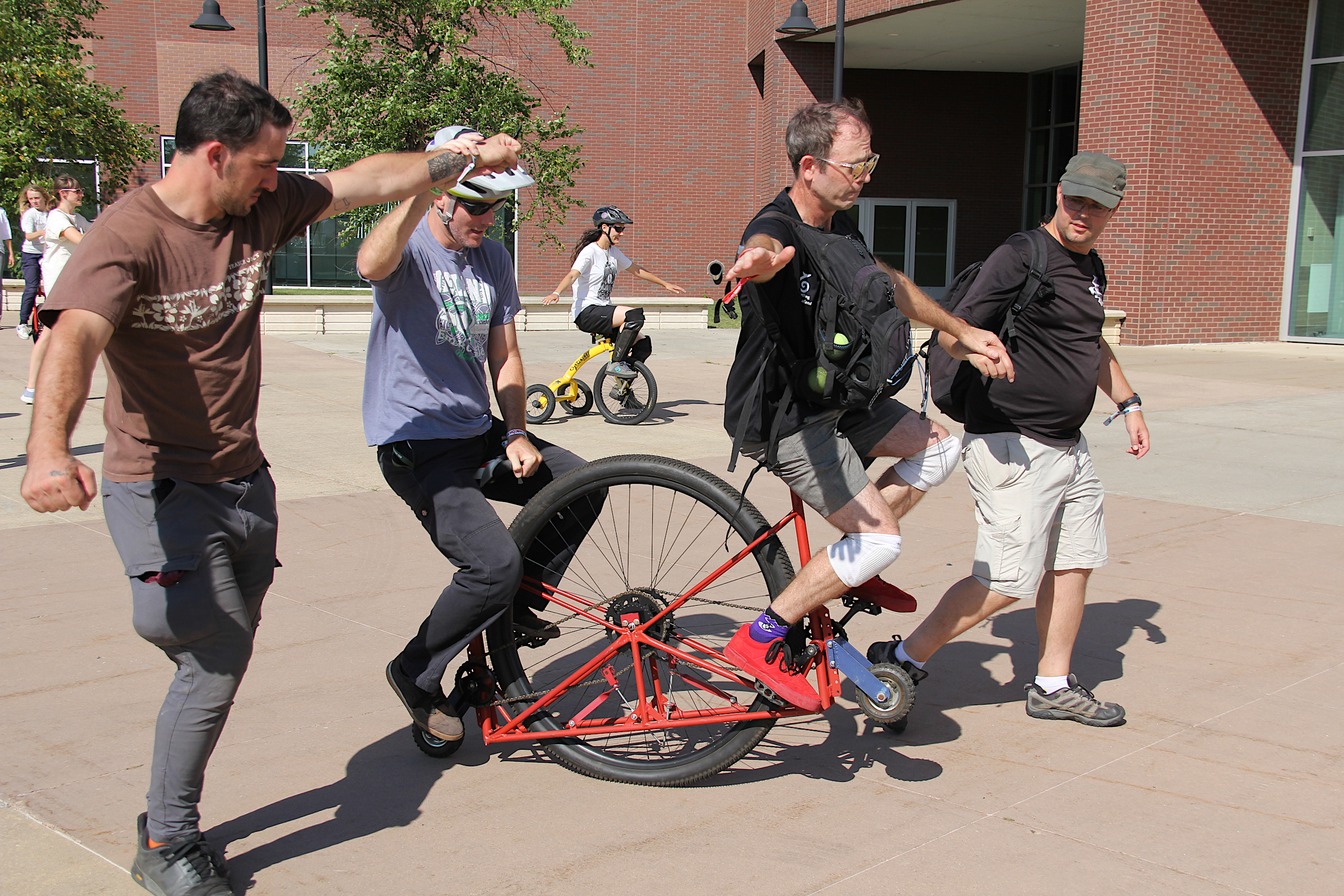 The Unicycle Museum was about much more than looking, reading, learning. It was also participatory, with most unicycles available for temporary check-out. Outside the Sanford Center, individuals of all ages and skill levels tried out an assortment of unicycles. Me? I passed.