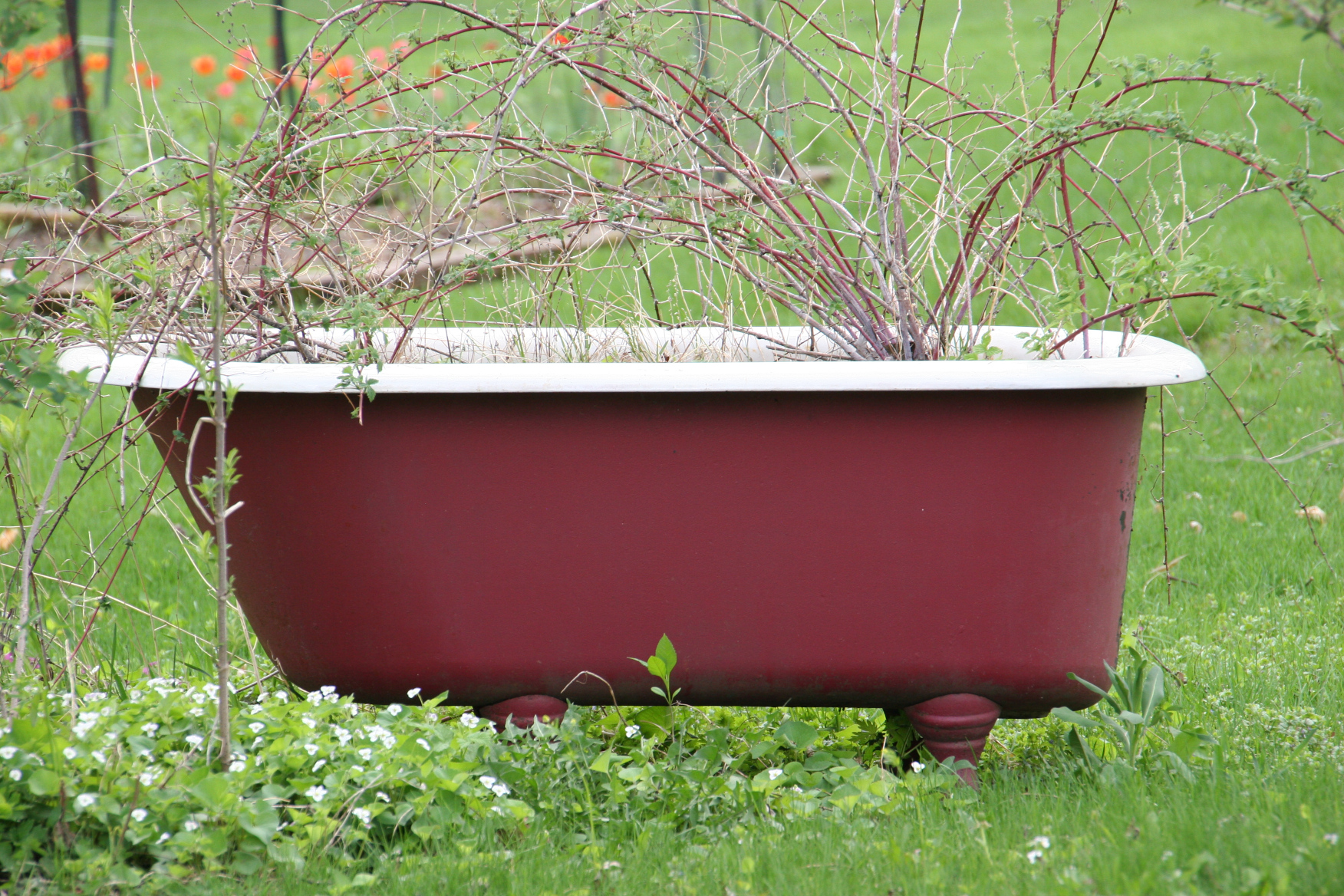 In that same backyard sits a vintage bathtub repurposed into a planter. The growth springing from the tub suggests these are raspberries. I didn’t feel comfortable moving in closer to confirm my guess.