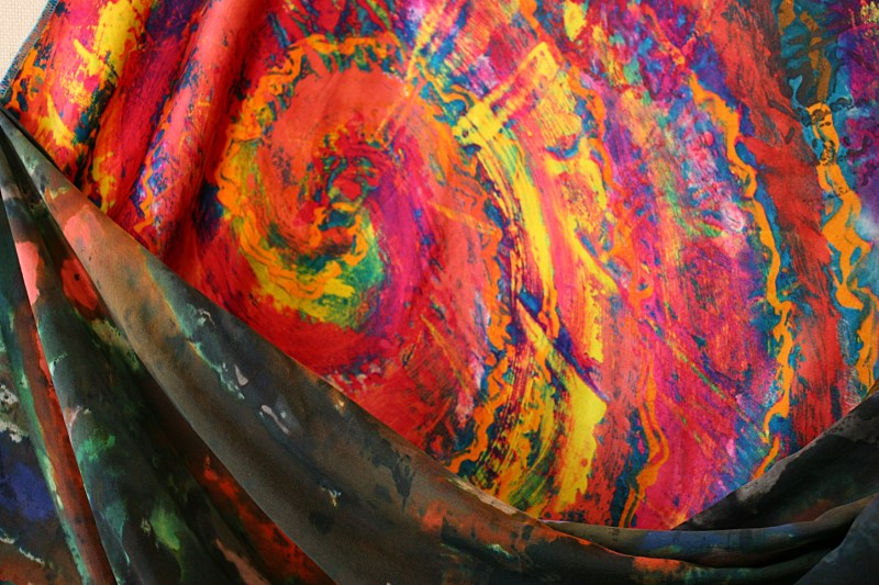 “It’s a Party!” yardage wall piece; both procion dyes and pigment paints all painted at the same time by Candy Kuehn.