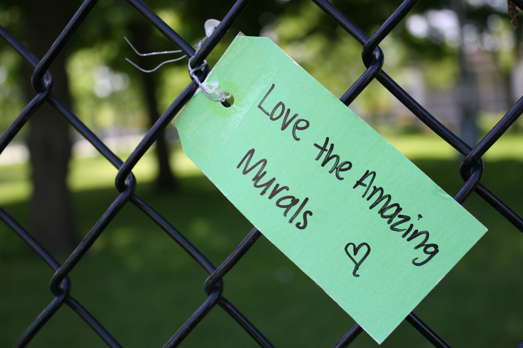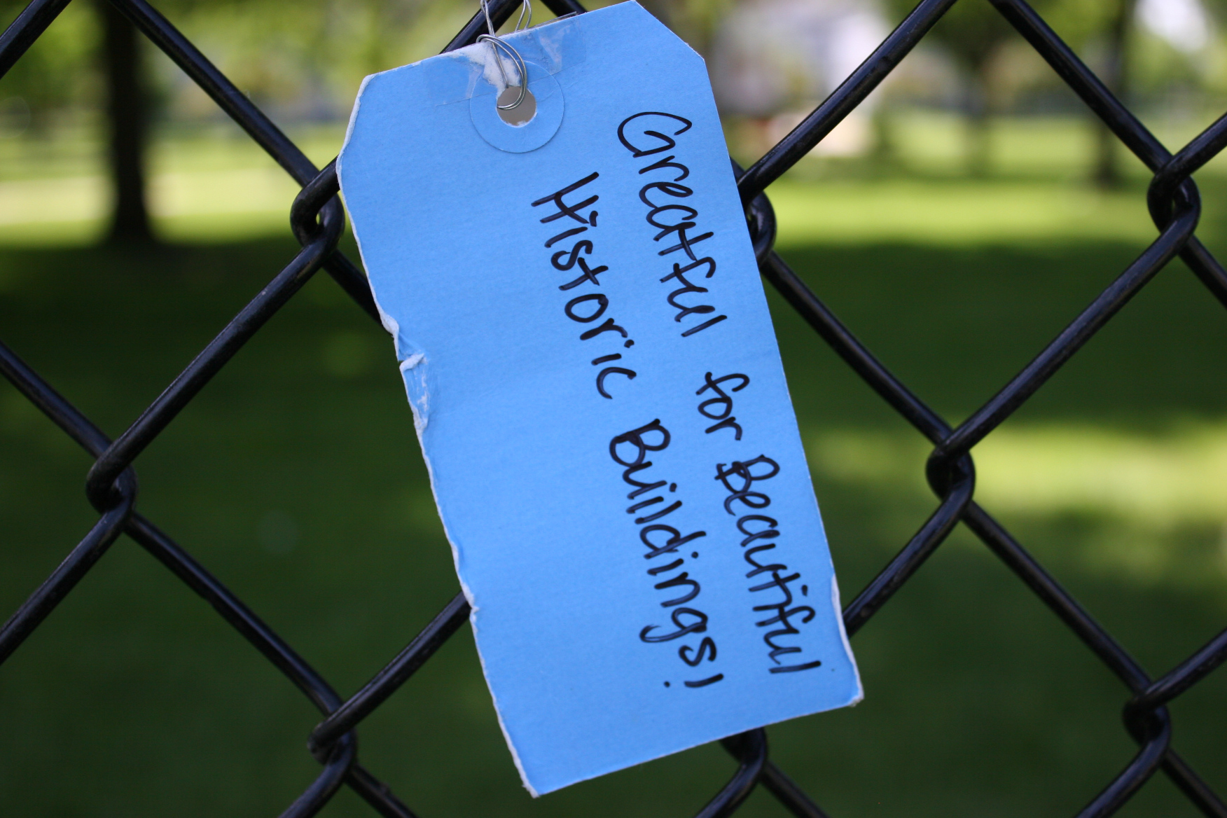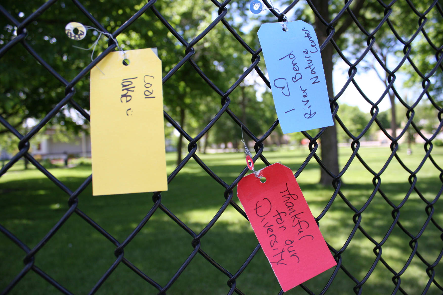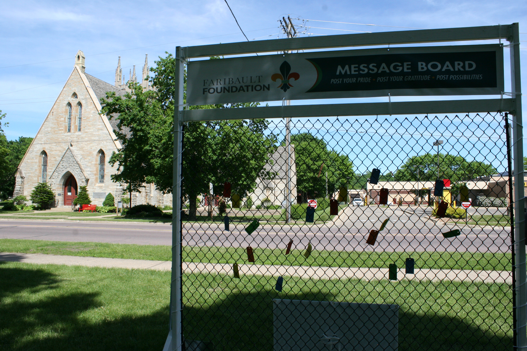 So what are people writing on the colorful tags wired onto the fence? On the Saturday afternoon I stopped to photograph the Message Board and then leave my thoughts, I counted 23 comments. Among the positives in Faribault—history, River Bend Nature Center, murals, historic buildings, diversity and more.