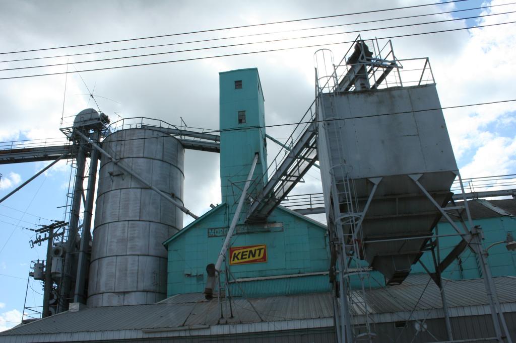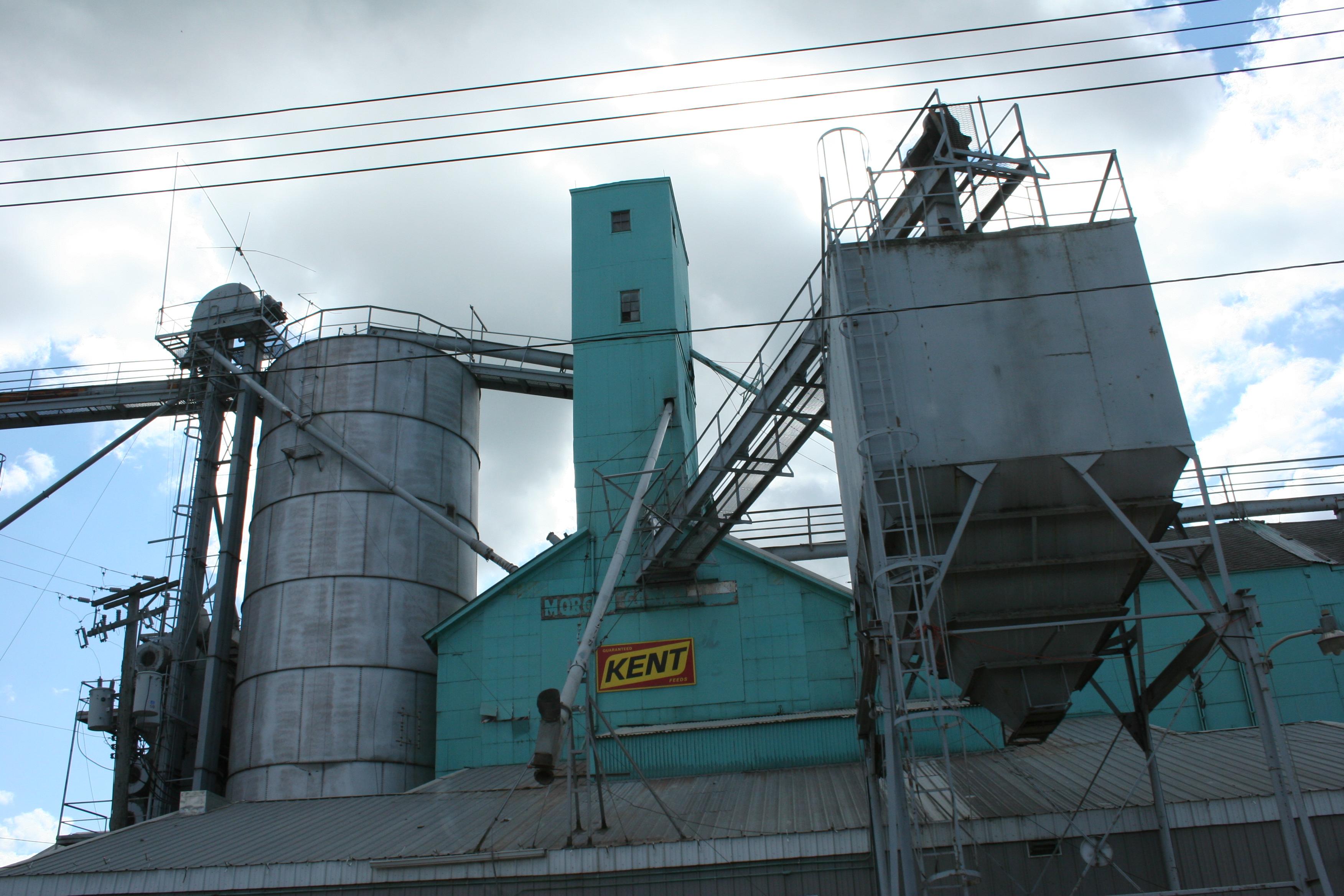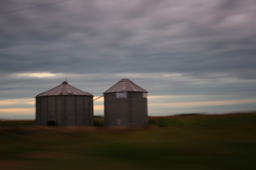 These grain bins sit a gravel road and short stretch of land away from the floodwaters of the Redwood River in Vesta.