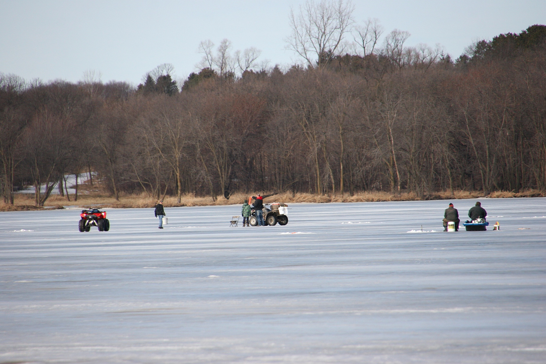 Ice fishing on Union Lake in Rice County. Some anglers don’t fish in houses, but rather in the open air, sitting on overturned 5-gallon buckets. (Minnesota Prairie Roots copyrighted file photo)