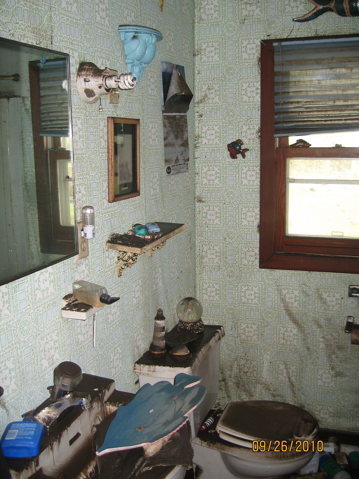 In the Williamsons' bathroom, a layer of muck covered everything. Floodwaters peeled the wallpaper off the walls. Photo by Sheri Ryan.