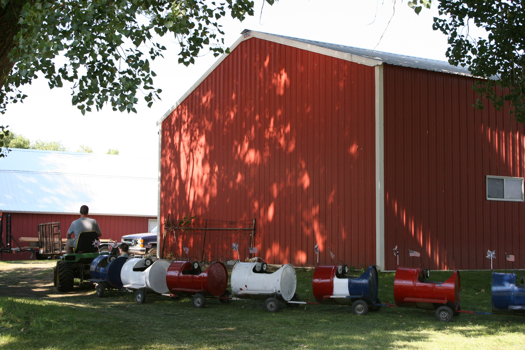 The homemade kiddie train crafted from barrels. Minnesota Prairie Roots photo.