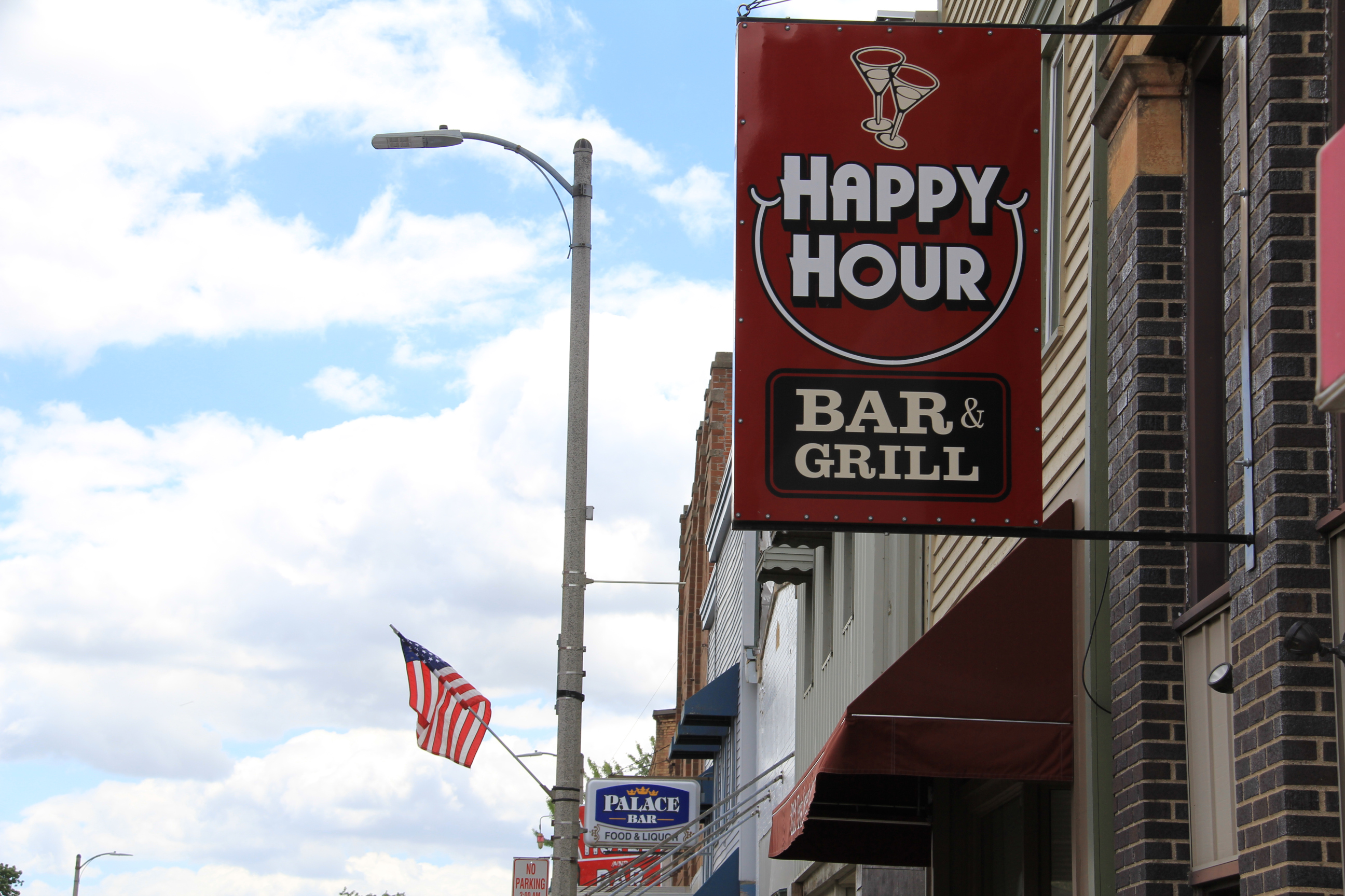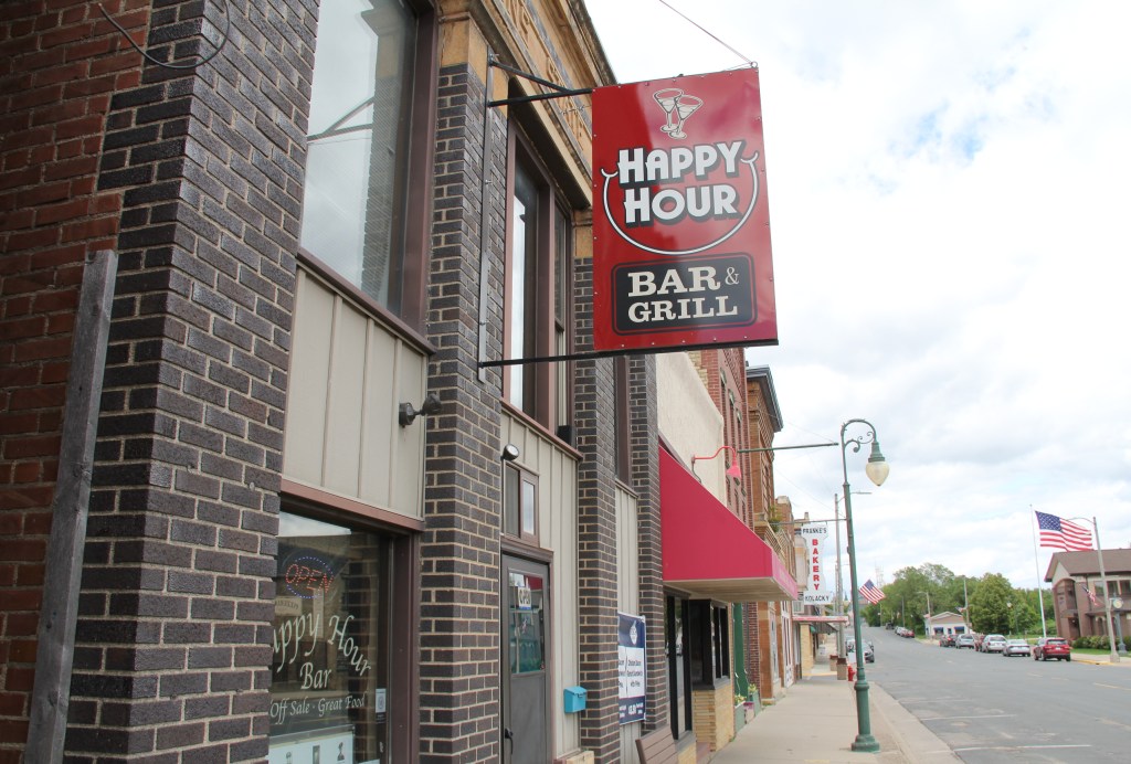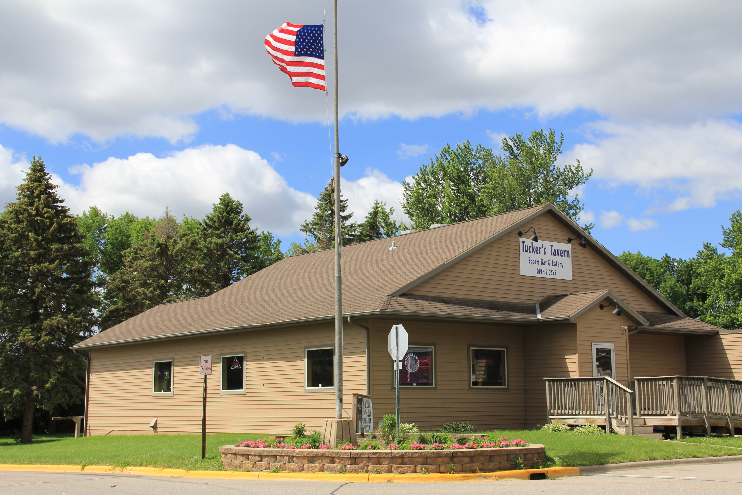 A flag flies high outside, Tucker’s Tavern, a popular restaurant and bar anchoring a downtown corner in Elysian. (Minnesota Prairie Roots copyrighted photo June 2024)