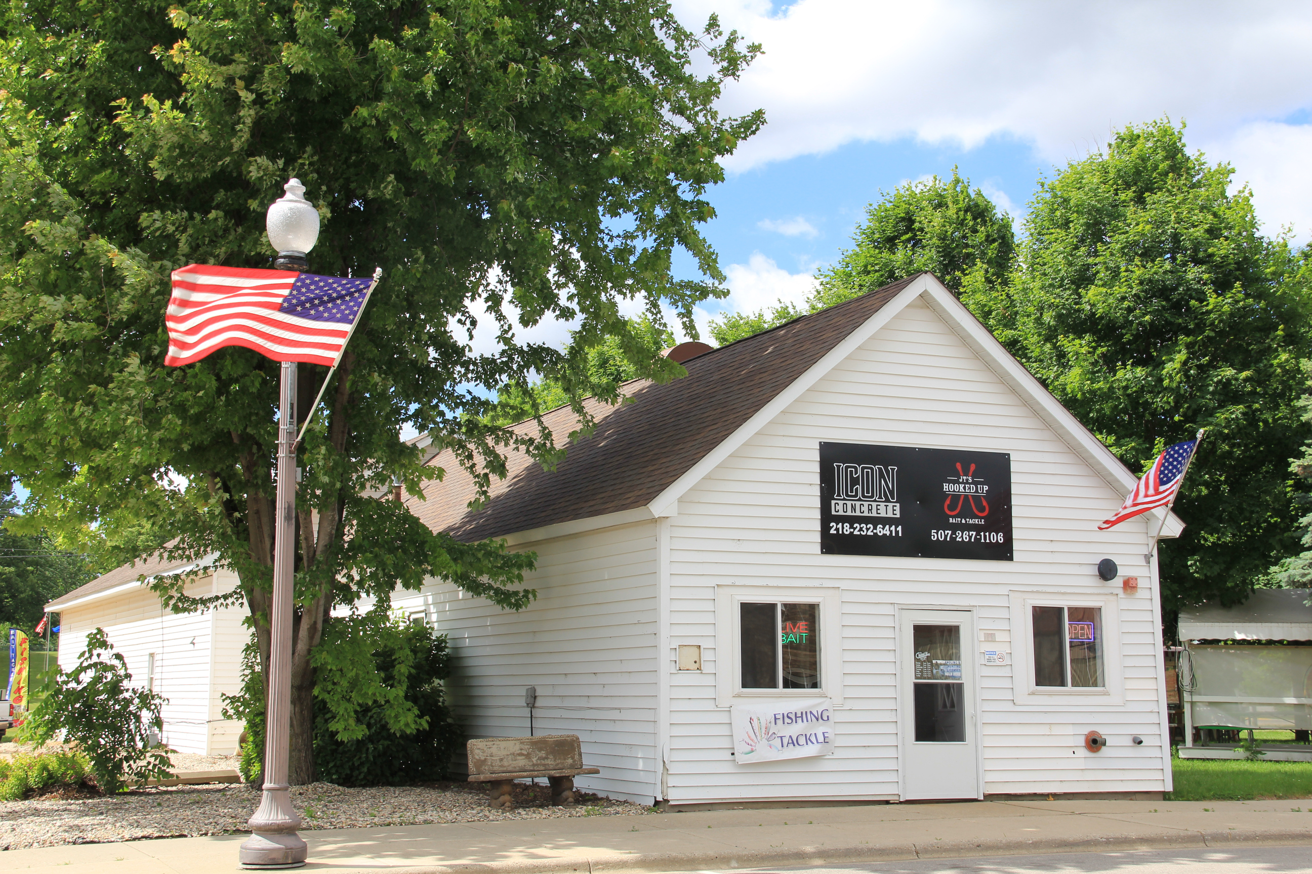 American flags fly on and near a bait shop in downtown Elysian. (Minnesota Prairie Roots copyrighted photo June 2024)