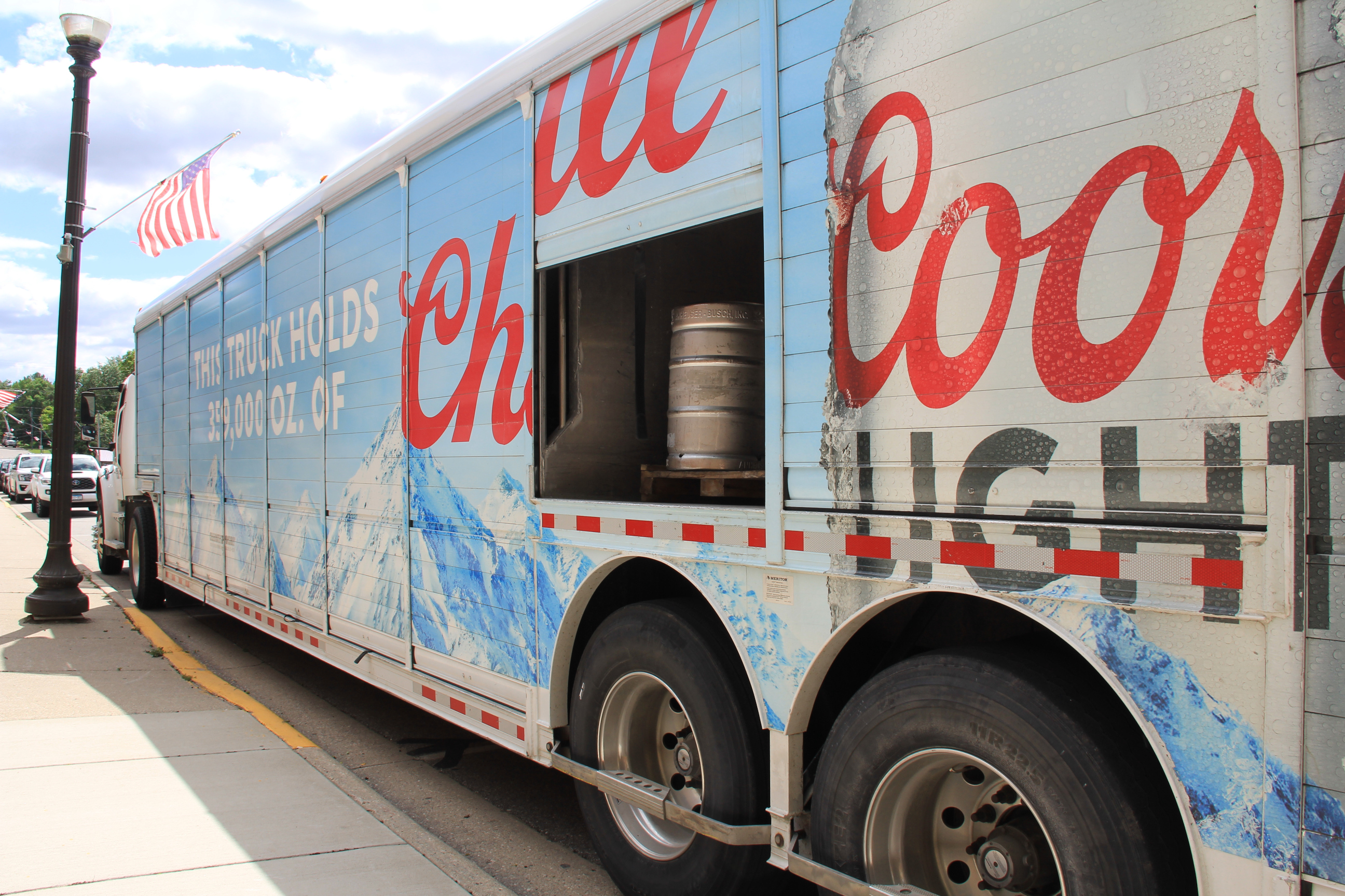 Red, white and blue in a beer delivery truck and an American flag. (Minnesota Prairie Roots copyrighted photo June 2024)
