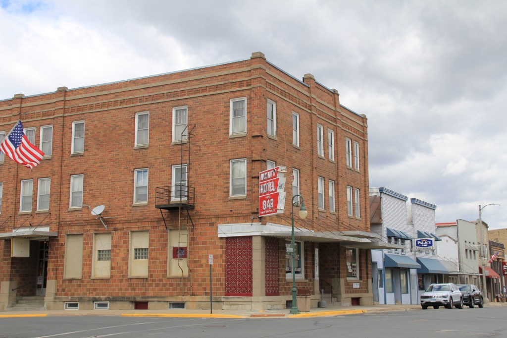 A flag flies near The Monty Bar, a mammoth building anchoring a corner. (Minnesota Prairie Roots copyrighted photo June 2024)