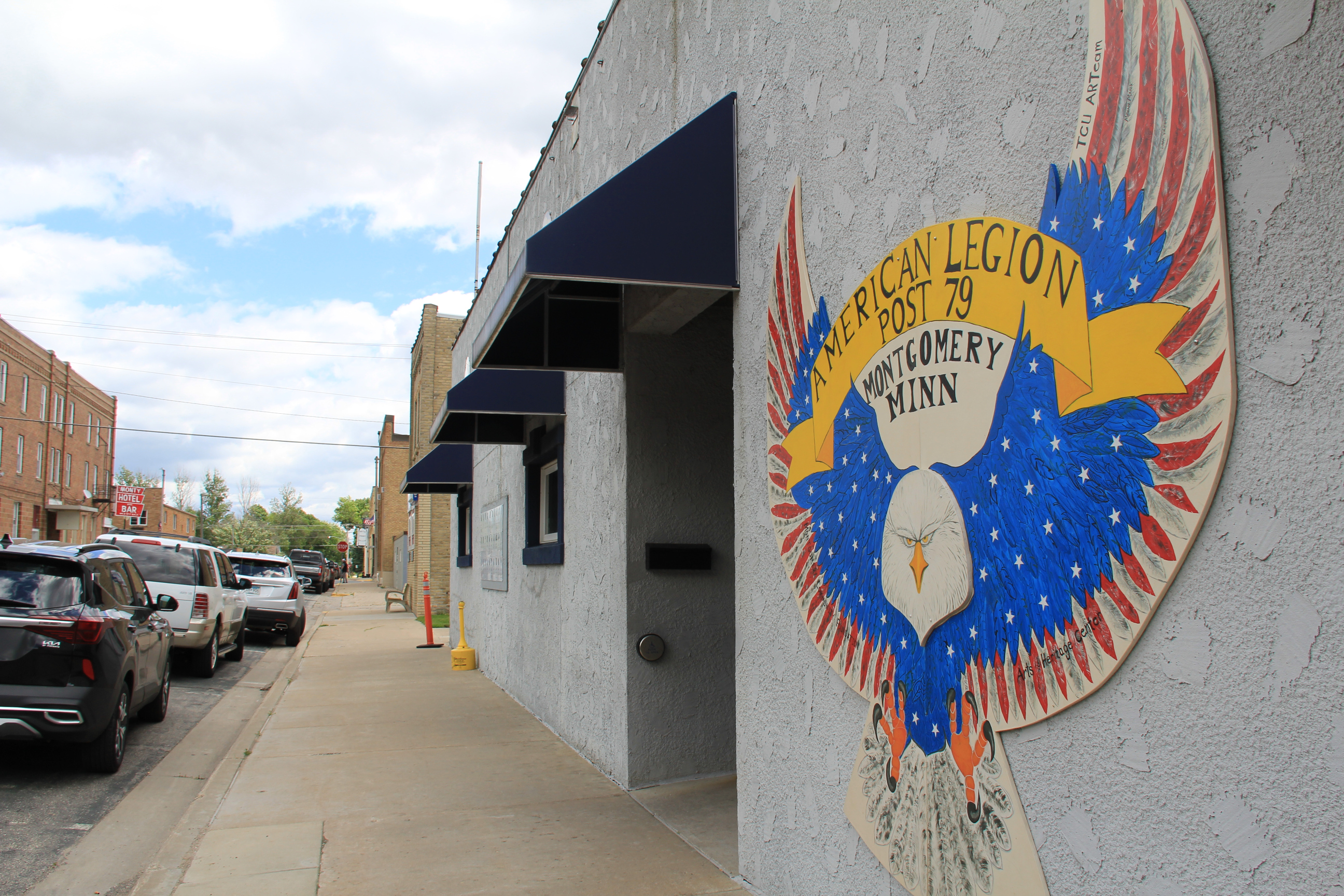 Patriotic art on Legion Post 79 is part of The Montgomery Wings Mural Walk. (Minnesota Prairie Roots copyrighted photo June 2024)
