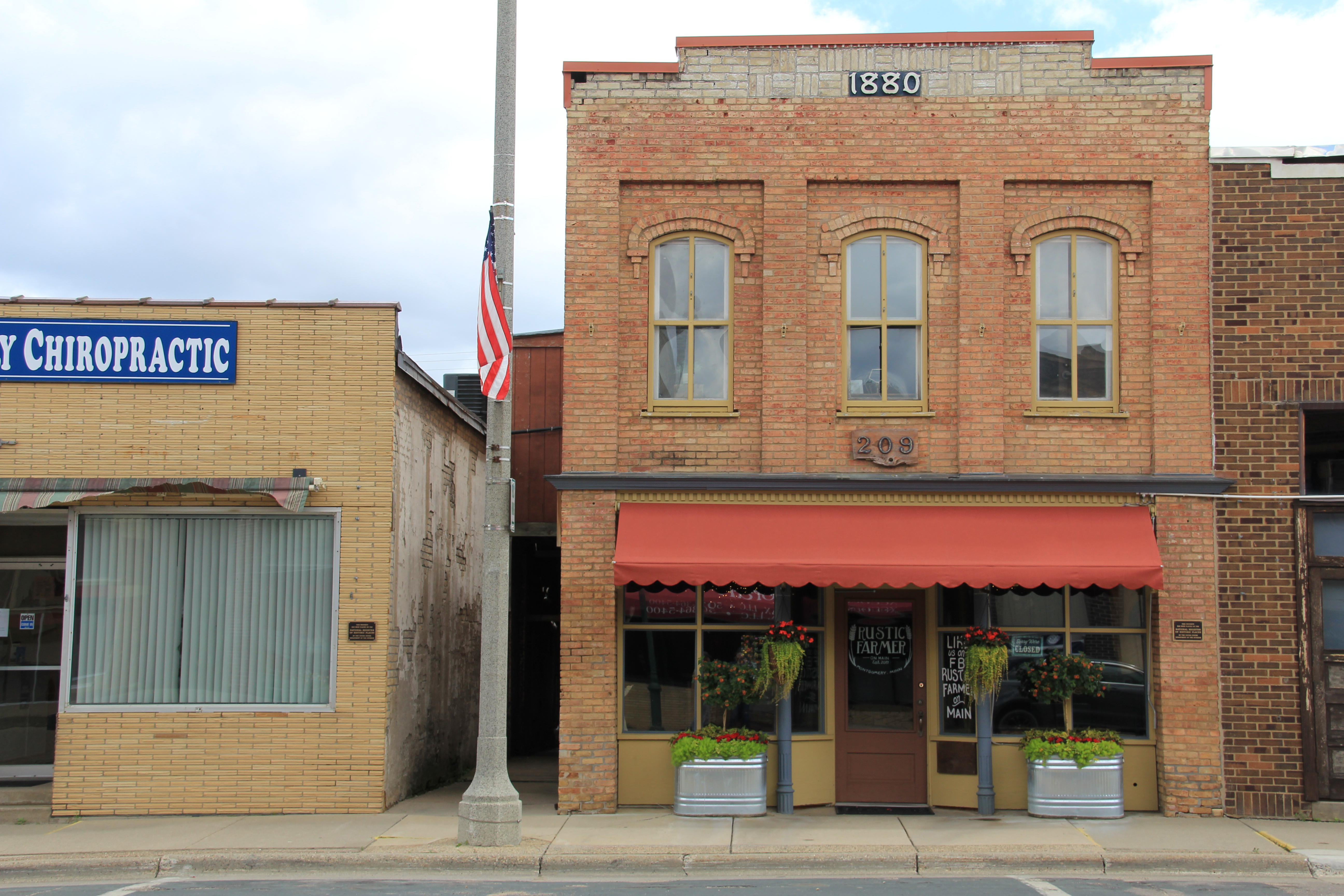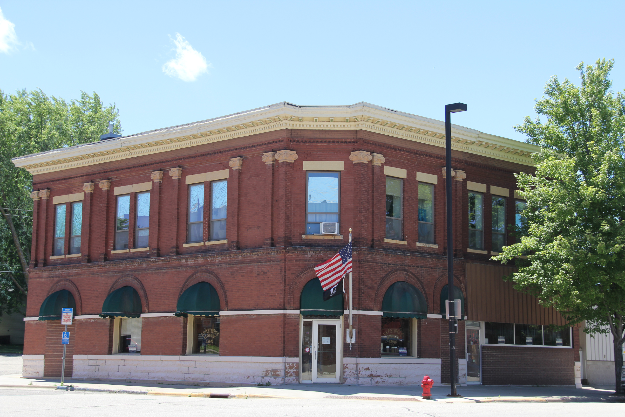 One of my favorite old buildings in Elysian, graced by a flag. (Minnesota Prairie Roots copyrighted photo June 2024)