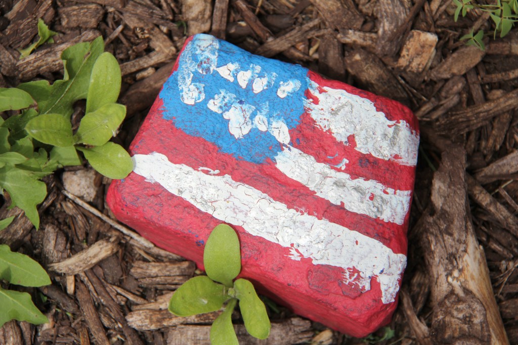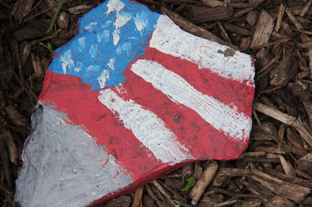 A flag rock in a flower garden at Most Holy Redeemer Catholic School. (Minnesota Prairie Roots copyrighted photo June 2024)