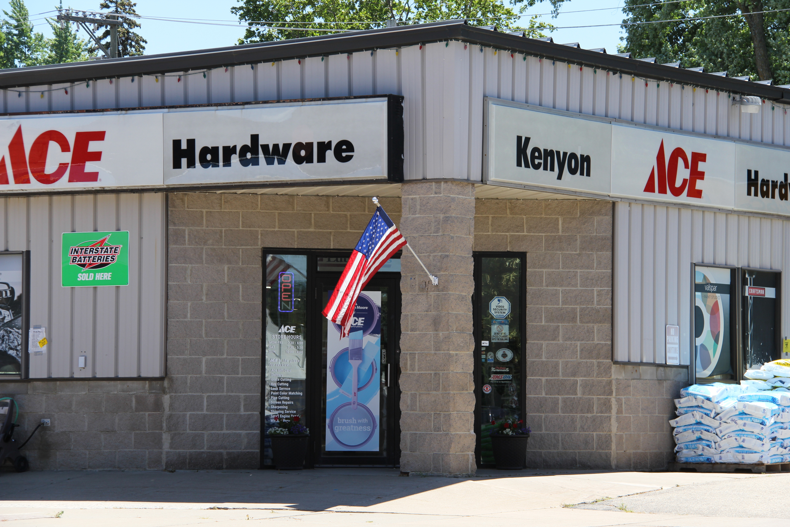A flag flies at Kenyon’s hardware store. (Minnesota Prairie Roots copyrighted photo June 2024)