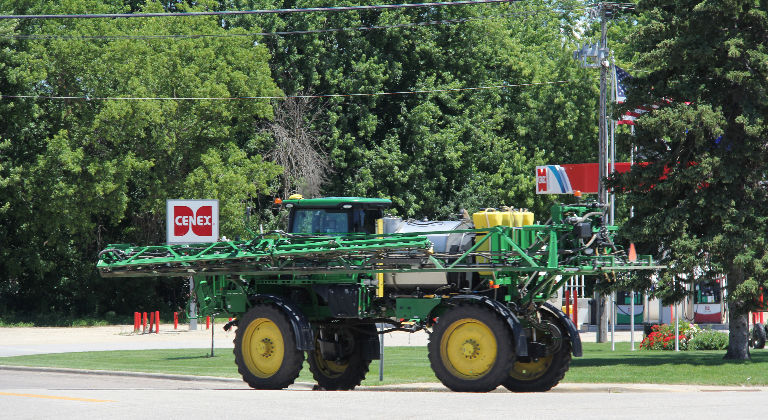 An American flag is barely visible to the right as a sprayer passes Kenyon’s veterans’ memorial. (Minnesota Prairie Roots copyrighted photo June 2024)