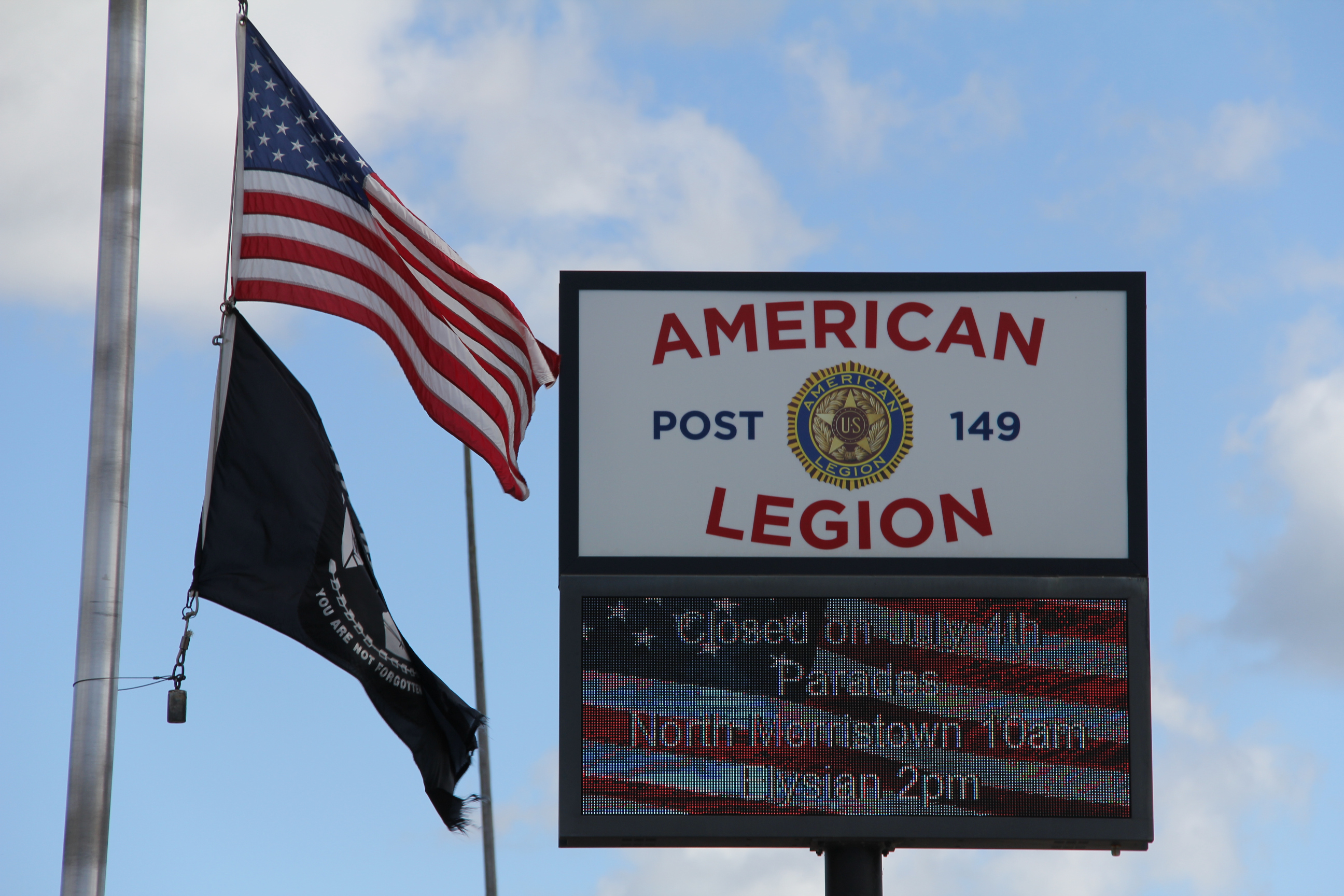 Nearby July 4 celebrations are promoted on the Morristown Legion sign. (Minnesota Prairie Roots copyrighted photo 2024)
