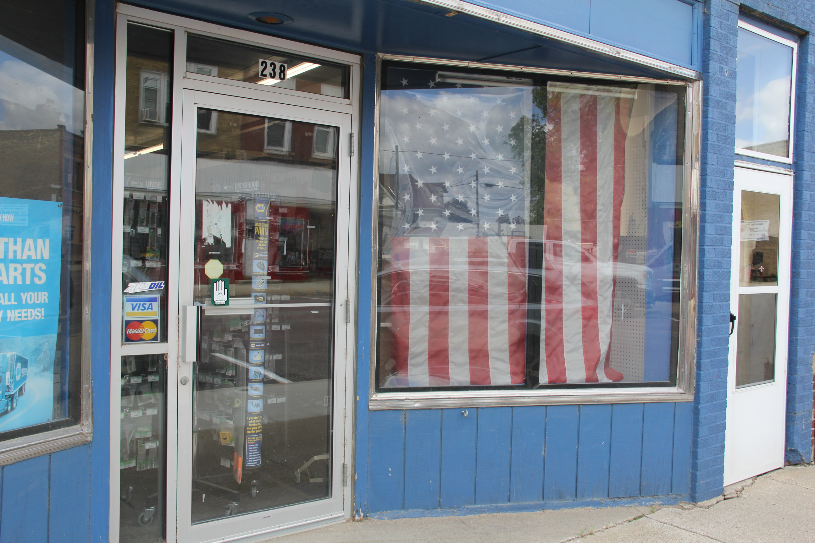 Patriotism in the front window of Twin Lakes Auto Parts in Waterville. (Minnesota Prairie Roots copyrighted photo June 2024)