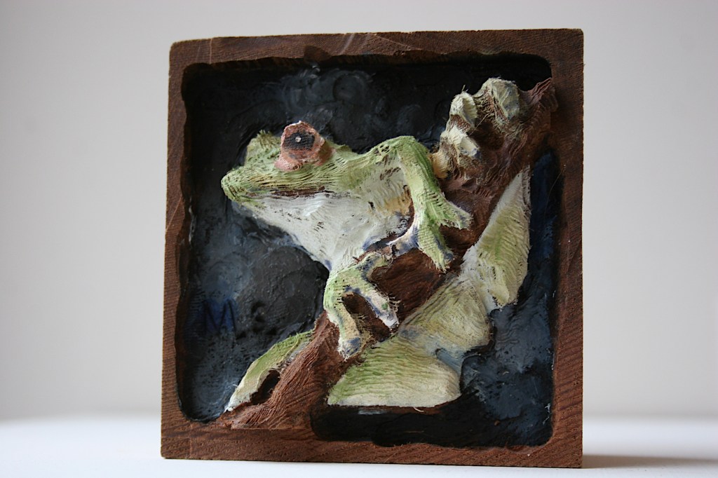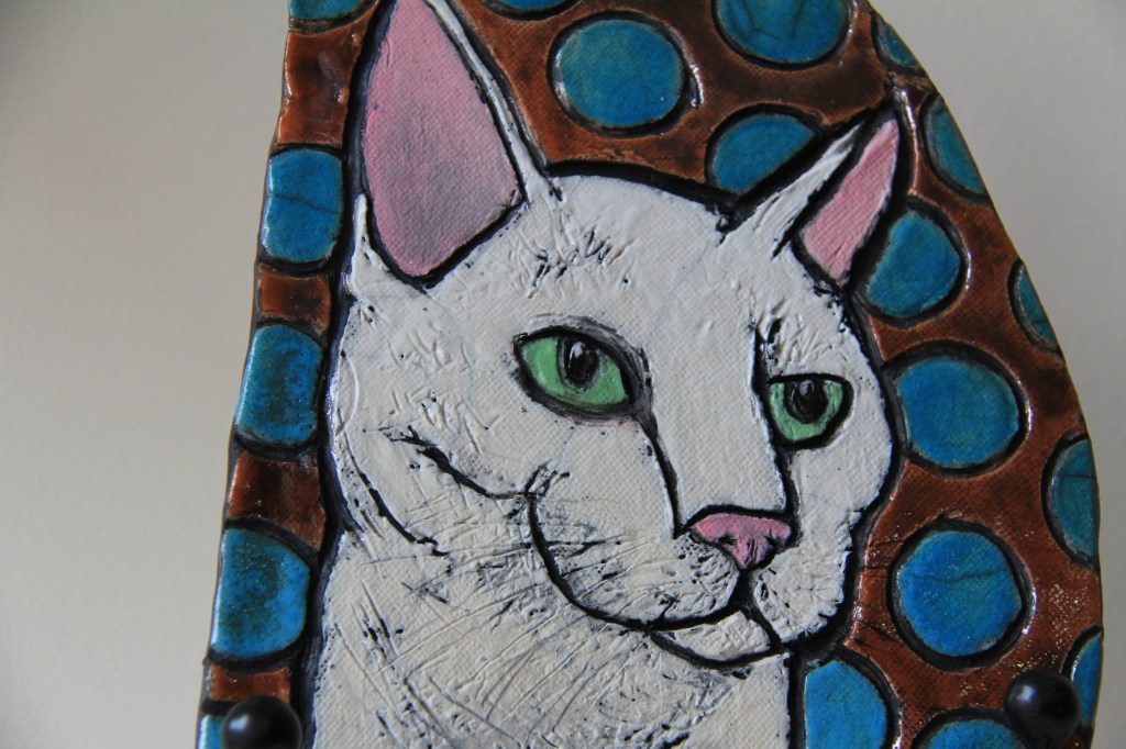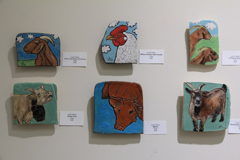 Fakler is a gifted artist, too, not unexpected from someone who leads an arts center. She specializes in animal portraits done primarily in clay. I’d recognize Fakler’s dogs, cats, goats, chickens, cows, pigs anywhere. They are bold, with personality. I could easily envision them on tee shirts, tote bags, greeting cards. They are uncomplicated and folksy in a way that reconnects me to my farm upbringing. And they are currently on exhibit in another Paradise gallery along with the work of those in a creative aging class.