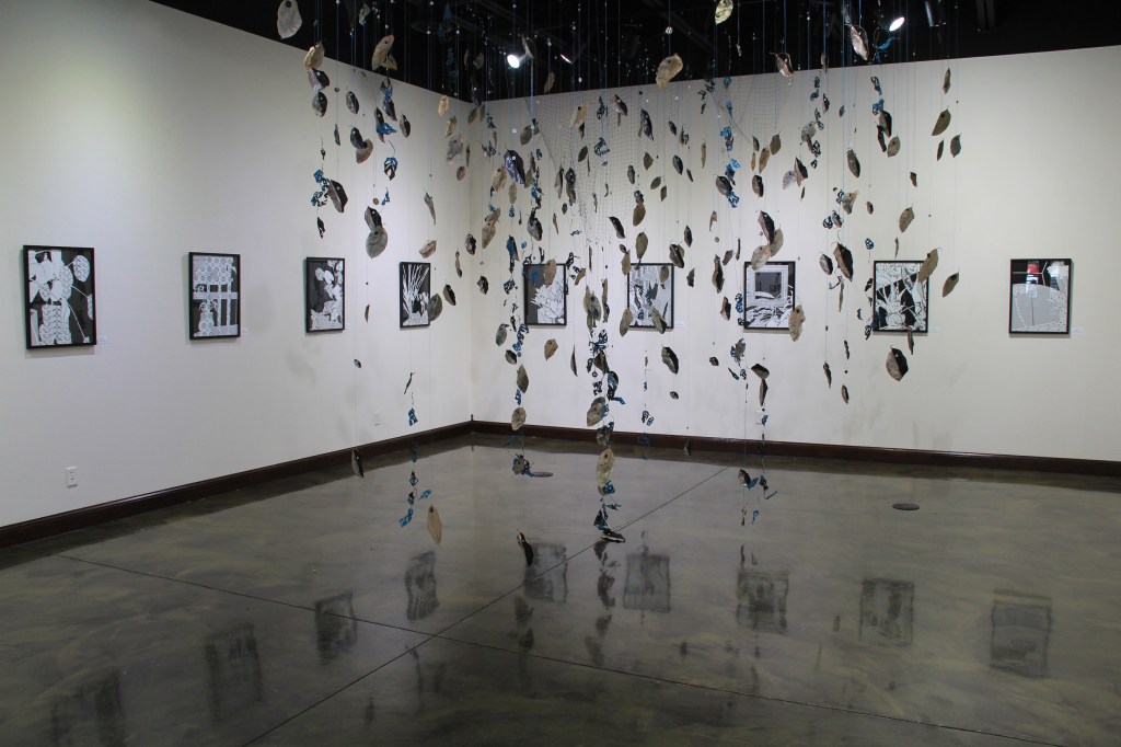 Real plant leaves, though, dangling and dancing, shape the focal centerpiece suspended from the gallery ceiling. There is movement. Freedom. A certain airiness.