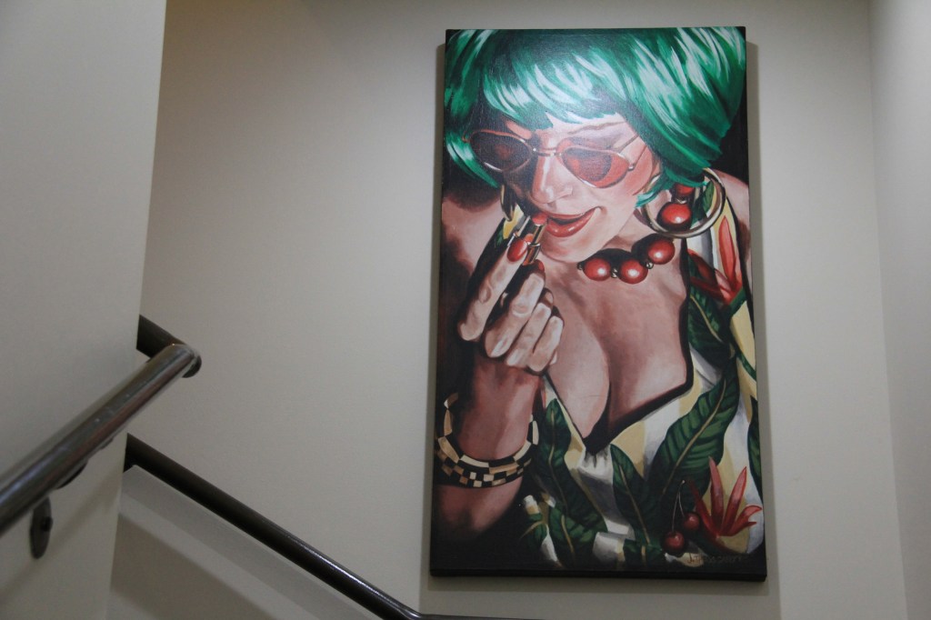 As I was about to head to the next gallery, Paradise Executive Director Julie Fakler pointed out an over-sized portrait of a glamorous woman on a stairway wall. The painting is the work of Jaclyn Theiss Garlock of Clear Lake, Iowa, and was a gift to the Paradise, part of its permanent art collection. The woman in the painting exudes strength, sass and attitude. I rather like her.