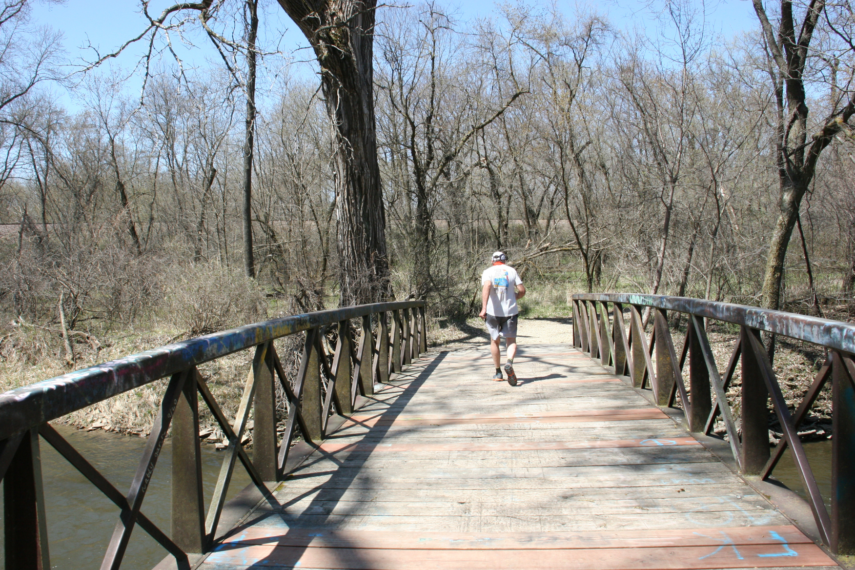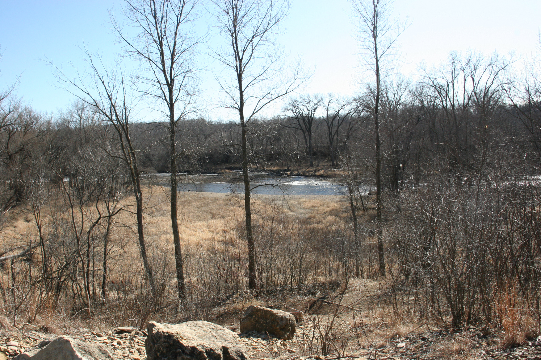 I am following the Straight River Trail in Faribault from Fleckenstein Bluffs Park. Daylight presses towards early evening with sunlight slanting, shadowing, scripting as I take in the woods, the river, the dried vegetation, then the hard lines of metal and stone.