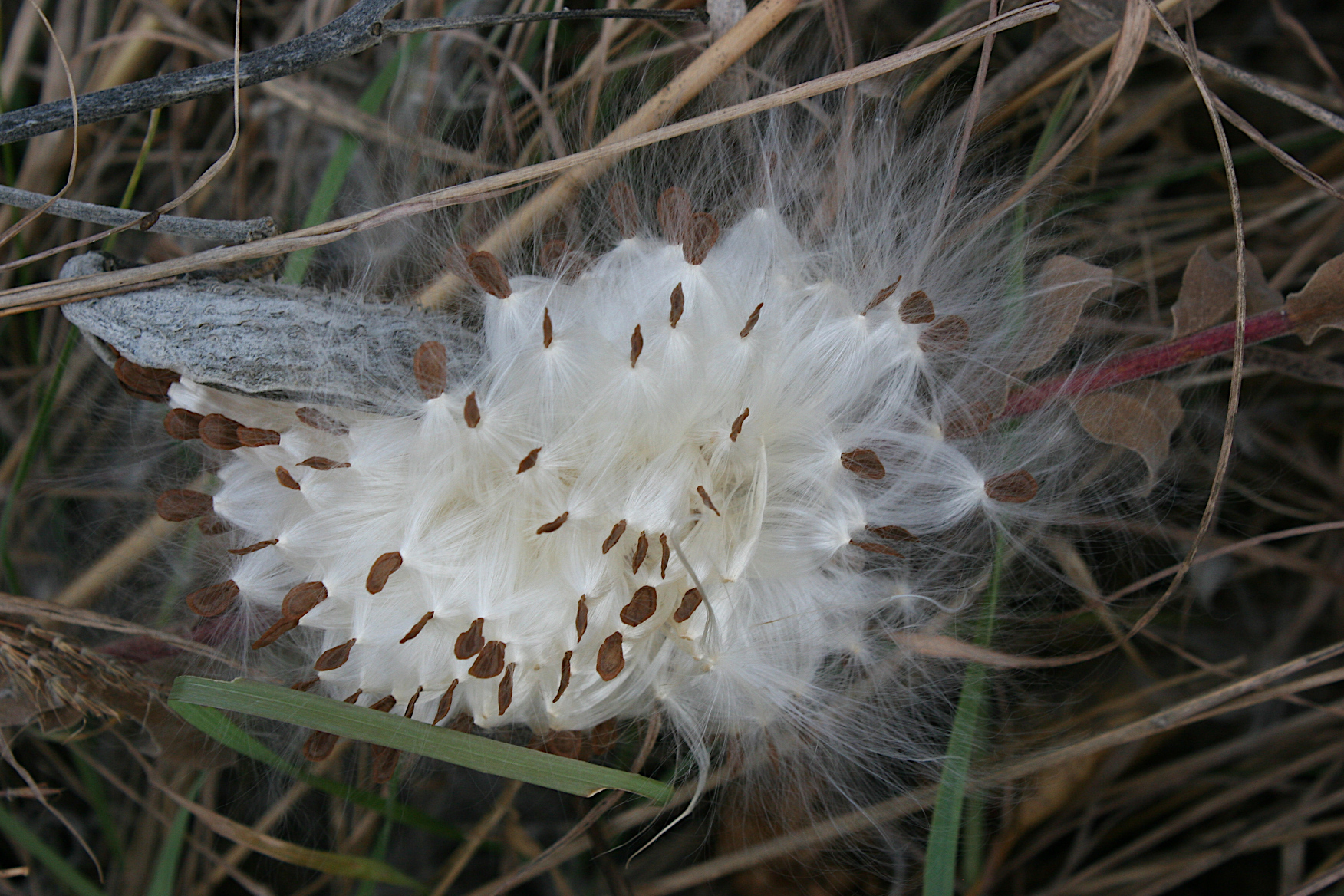 A dried milkweed pod burst open on the prairie. (Minnesota Prairie Roots copyrighted file photo November 2021)