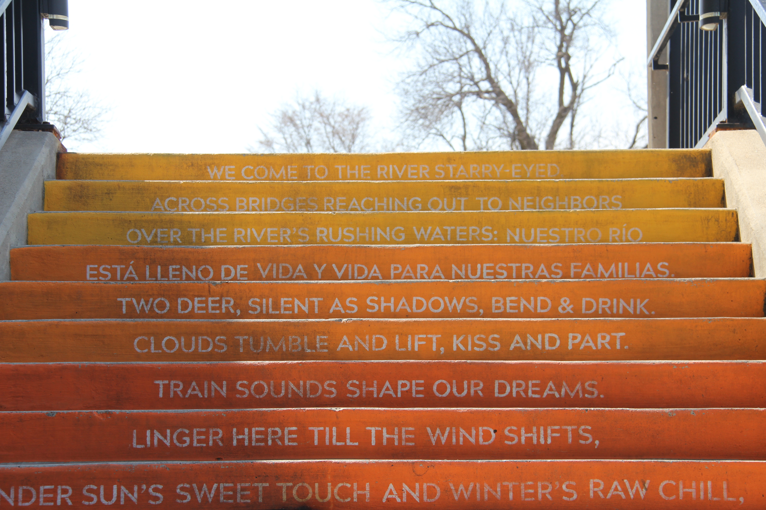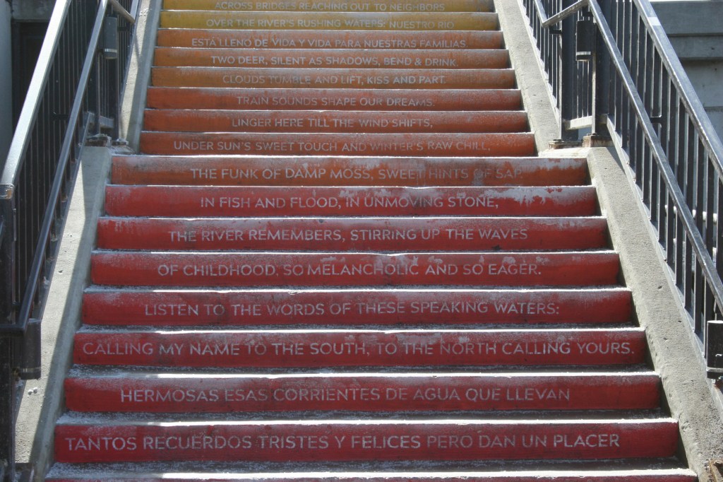 After hanging around the river by Bridge Square for a bit, I descend the colorful Riverwalk Poetry Steps, a river poem crafted by a collaboration of 17 poets. We come to the river starry-eyed/across bridges reaching out to neighbors/over the river’s rushing waters…