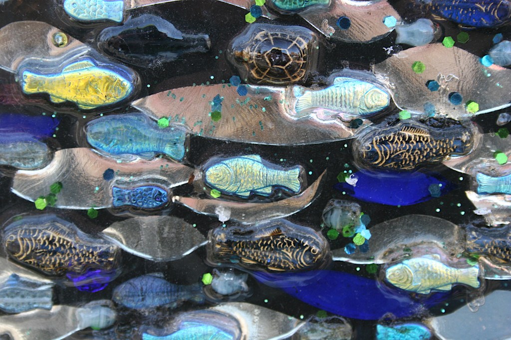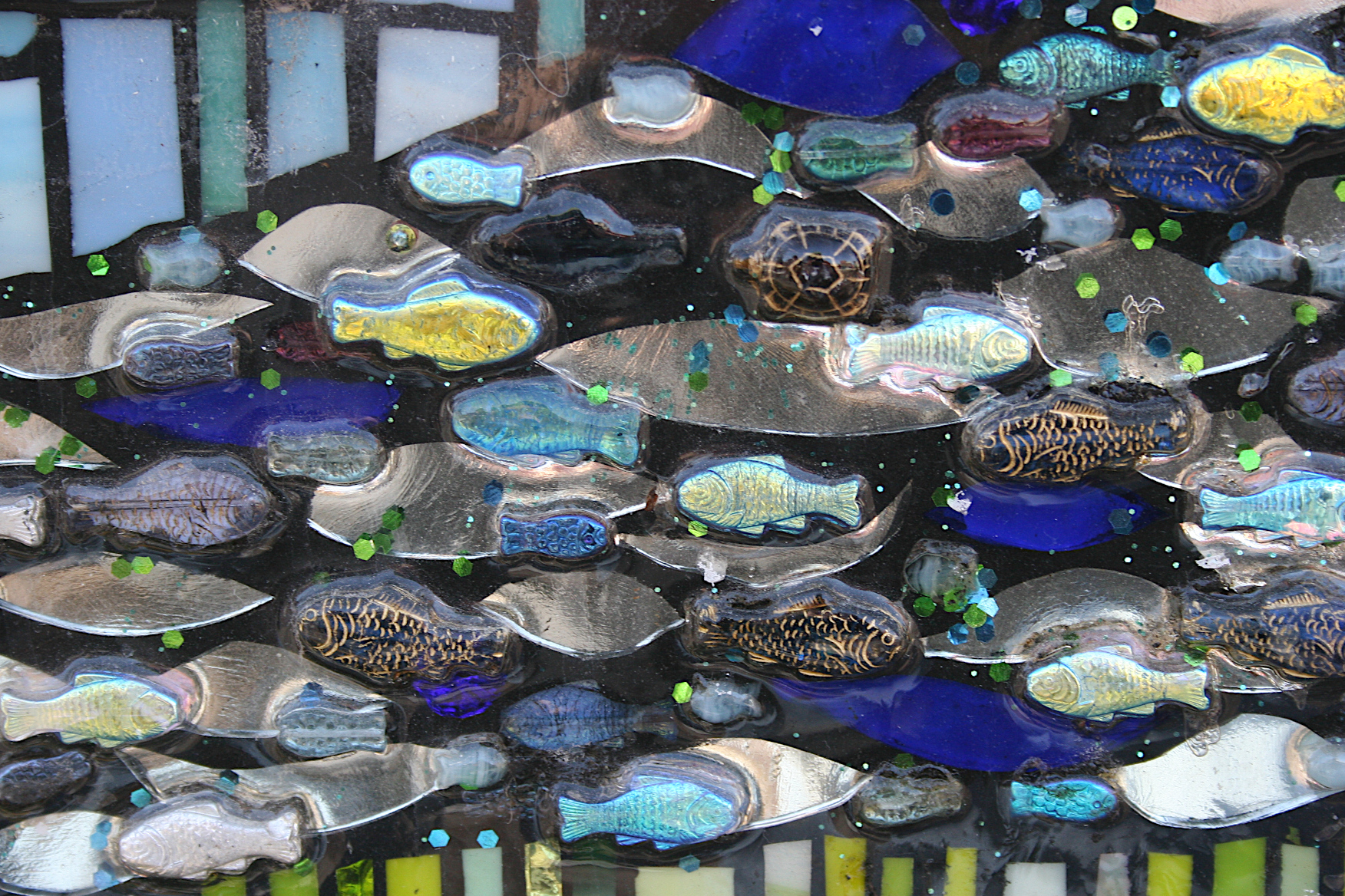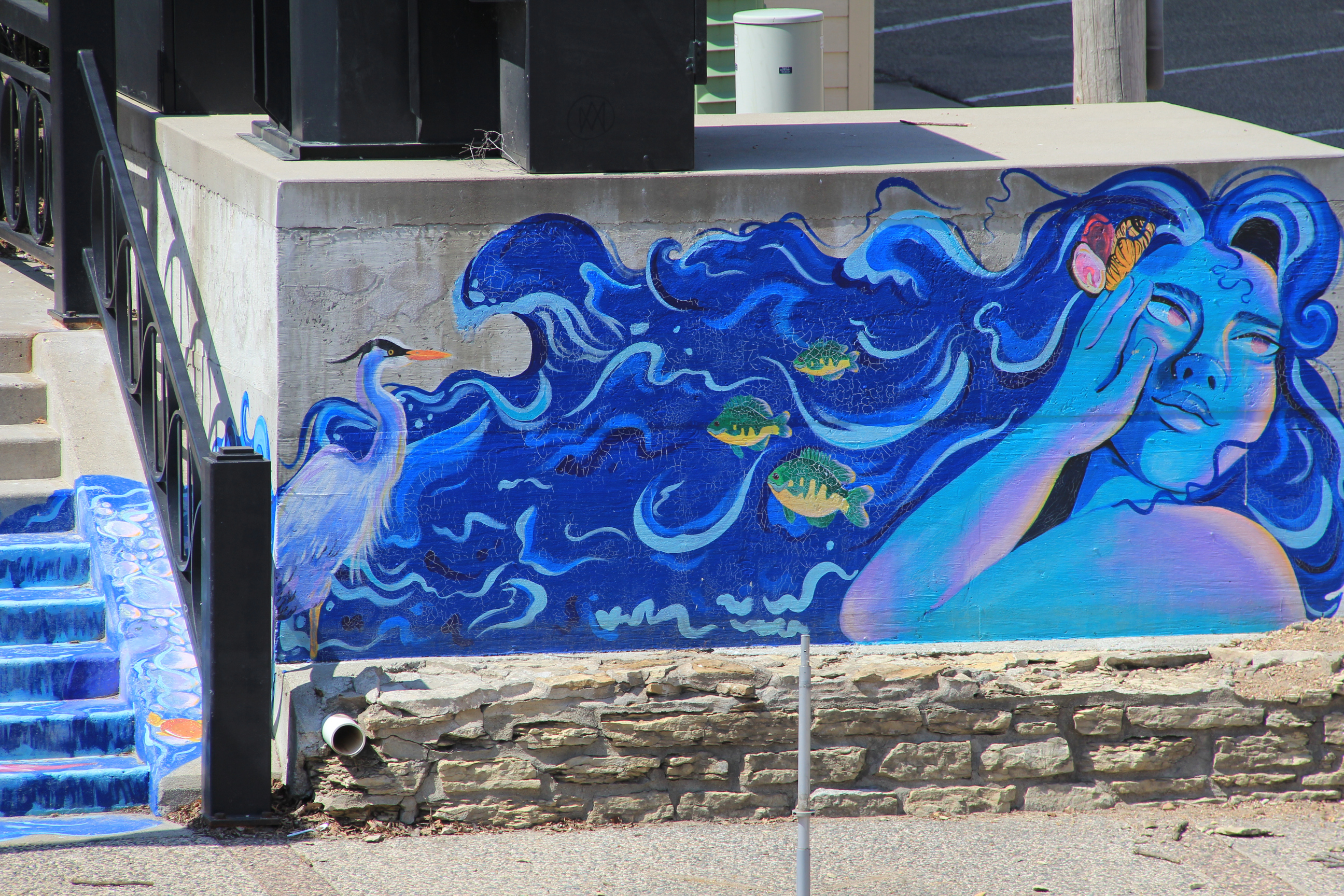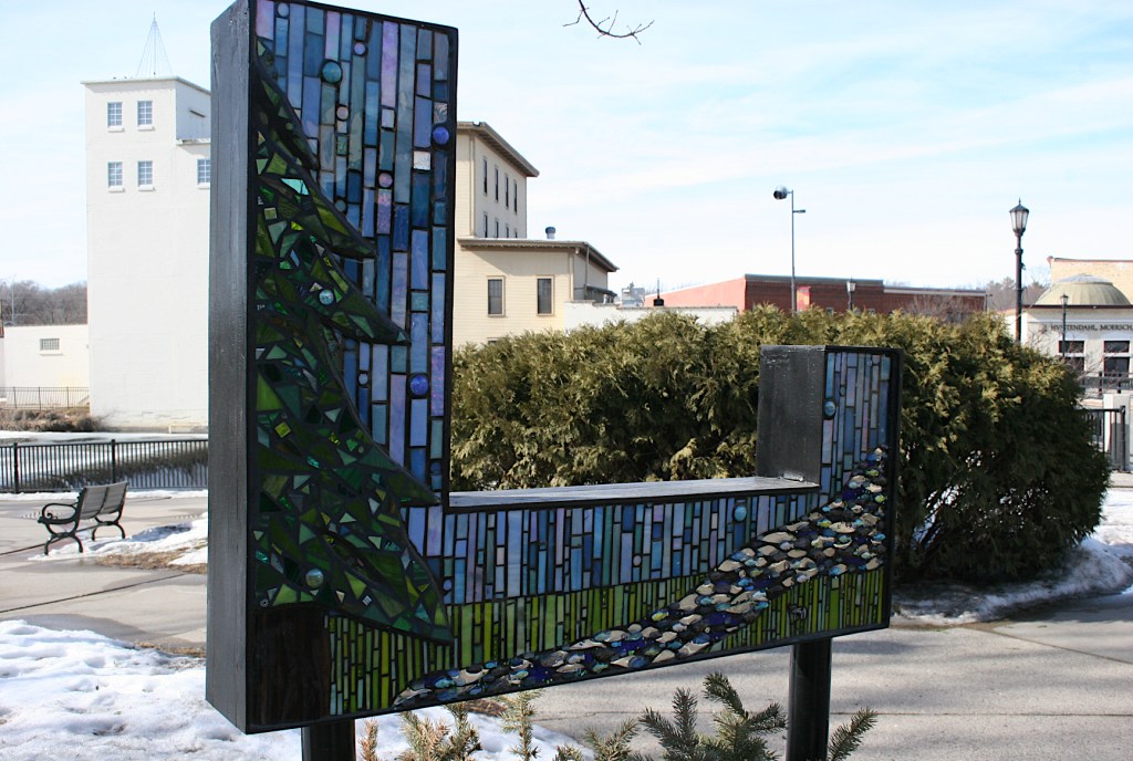 I appreciate how Ward melded art and nature in creating a mosaic which honors both. As I studied her interpretation of the Cannon River, I recognized the thought she invested in this detailed art of many many pieces. Her river evokes movement in waters teeming with fish and the occasional turtle. Assorted greens and blues evoke a sense of calm and peacefulness. Ward’s art honors this river which runs through. This river of life, now a backdrop to a community which still appreciates her beauty, her recreational qualities, her history, her aesthetic value.
