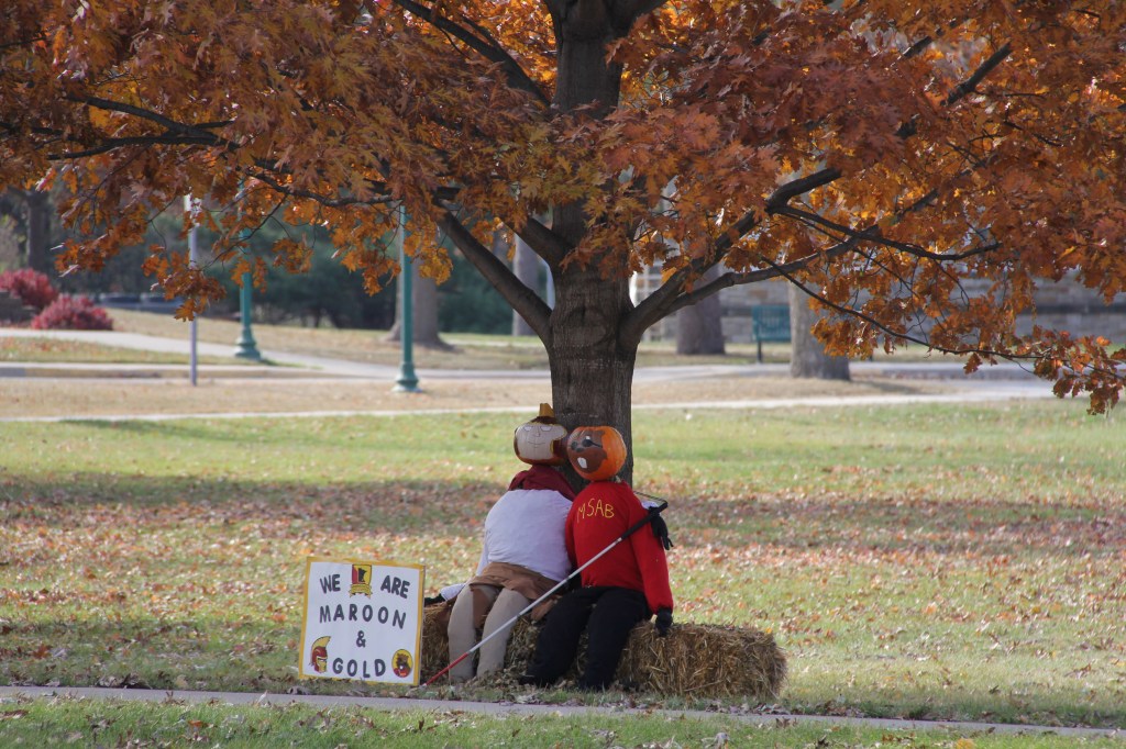 Side-by-side scarecrows from each academy. Trojans, left at MSAD and Gophers, right at MSAB. (Minnesota Prairie Roots copyrighted photo October 2022)