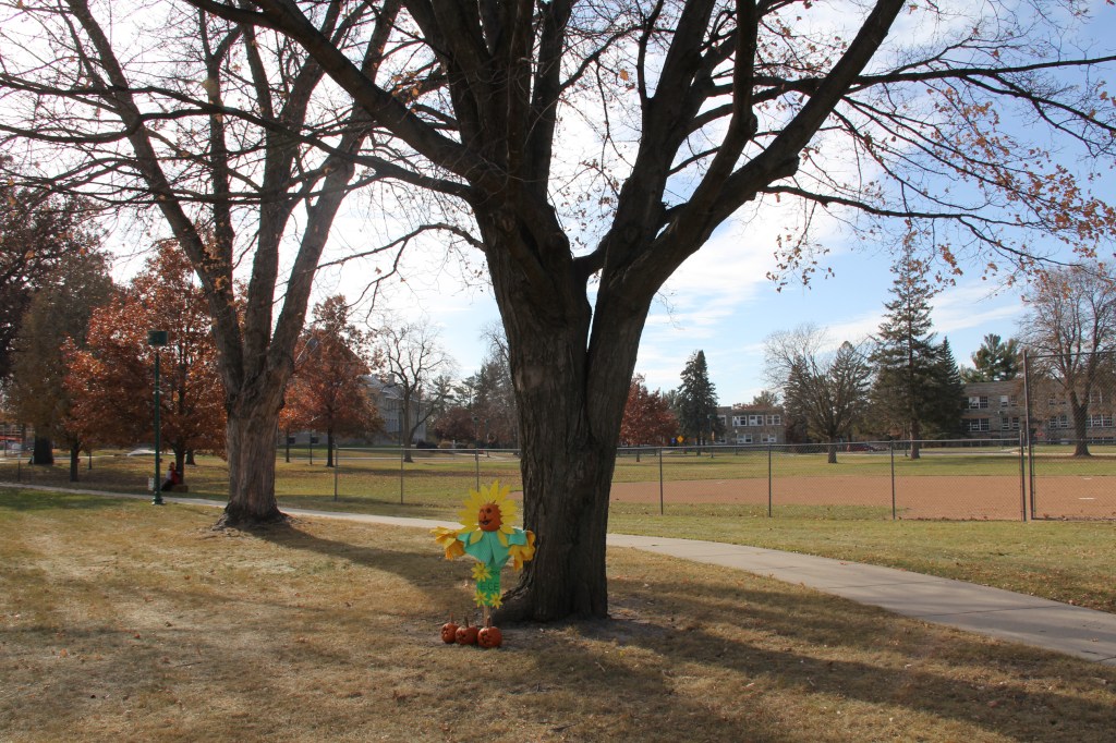 An early childhood scarecrow displayed next to the ball field and green space which center the MSAD campus. (Minnesota Prairie Roots copyrighted photo October 2022)