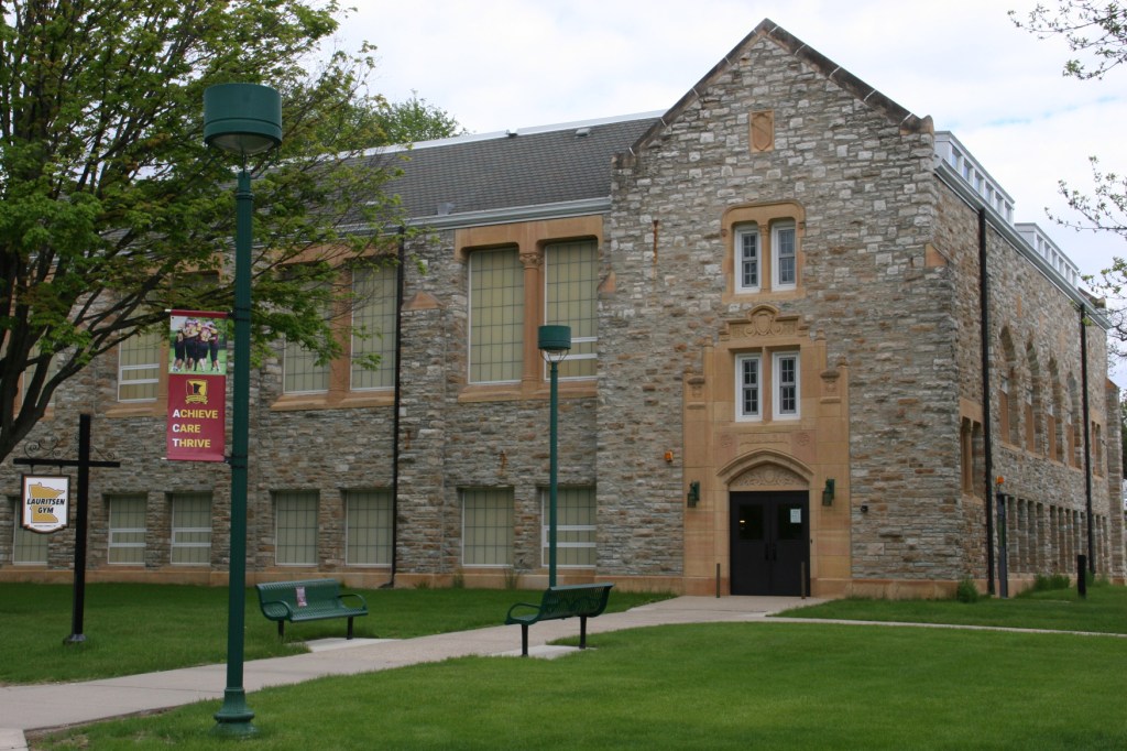 Achieve. Care. Thrive. ACT banners a sign outside Lauritsen Gym at MSAD. (Minnesota Prairie Roots copyrighted photo May 2022)