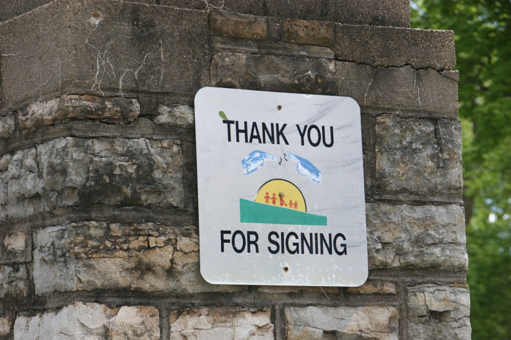 A sign posted on a pillar at MSAD and viewed when exiting the campus. (Minnesota Prairie Roots copyrighted photo May 2022)
