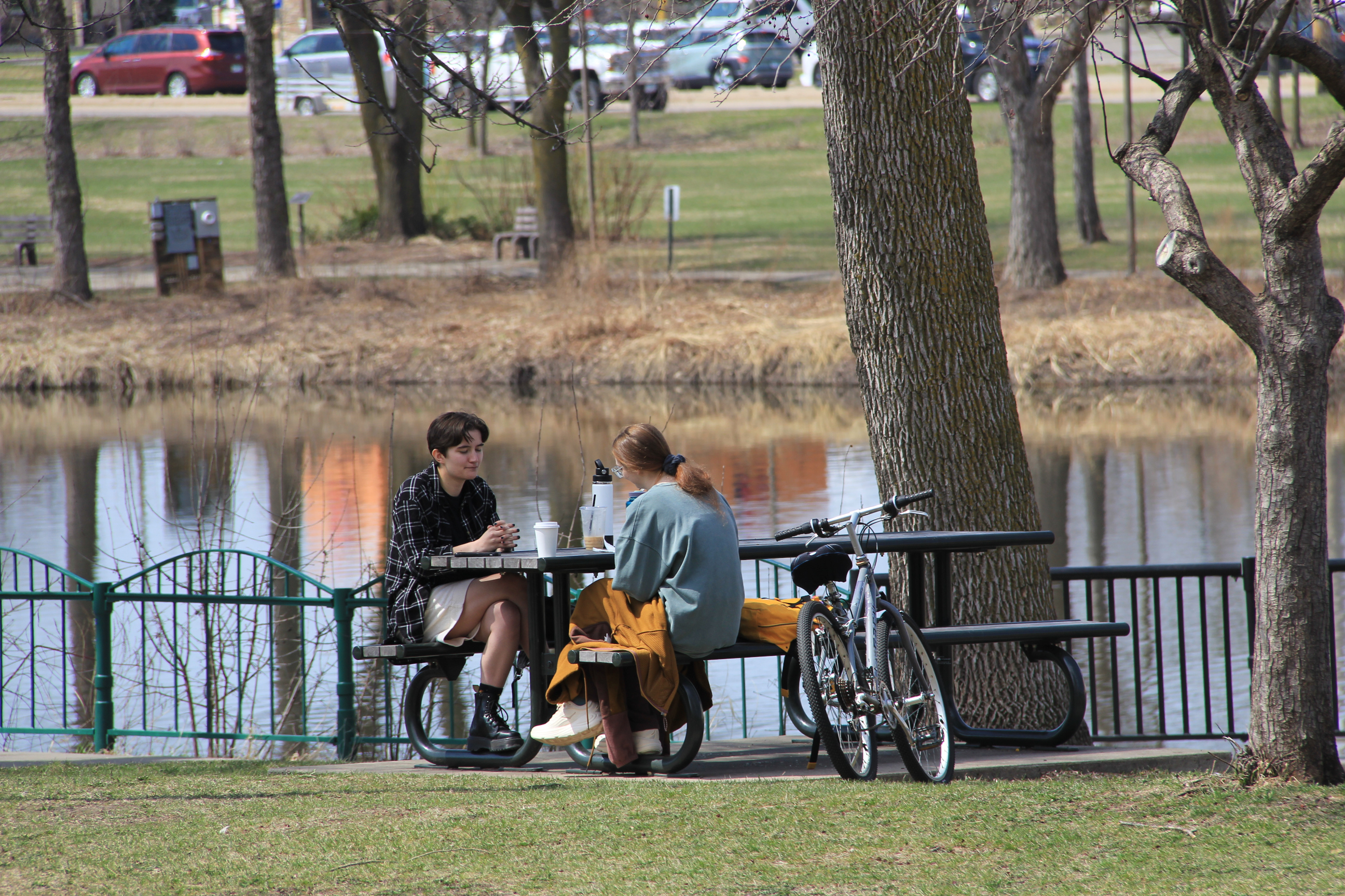Enjoying beverages and time together beside the Cannon River in Bridge Square. (Minnesota Prairie Roots copyrighted photo April 2025)
