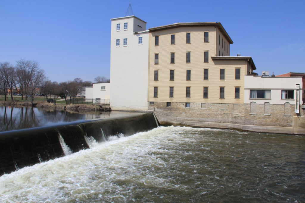 The Cannon River spills over the dam by the historic Ames Mill. (Minnesota Prairie Roots copyrighted photo April 2025)