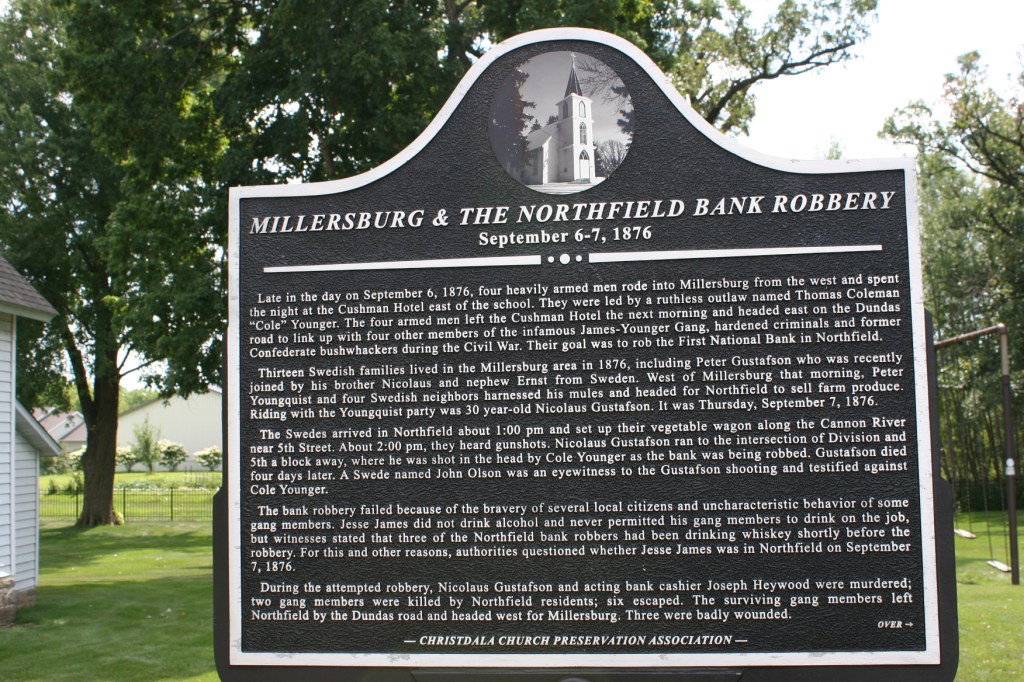 The former Millersburg School now houses a museum operated by the Christdala Preservation & Cemetery Association. Exhibits include school and church items, tools and info related to the James-Younger bank robbery.