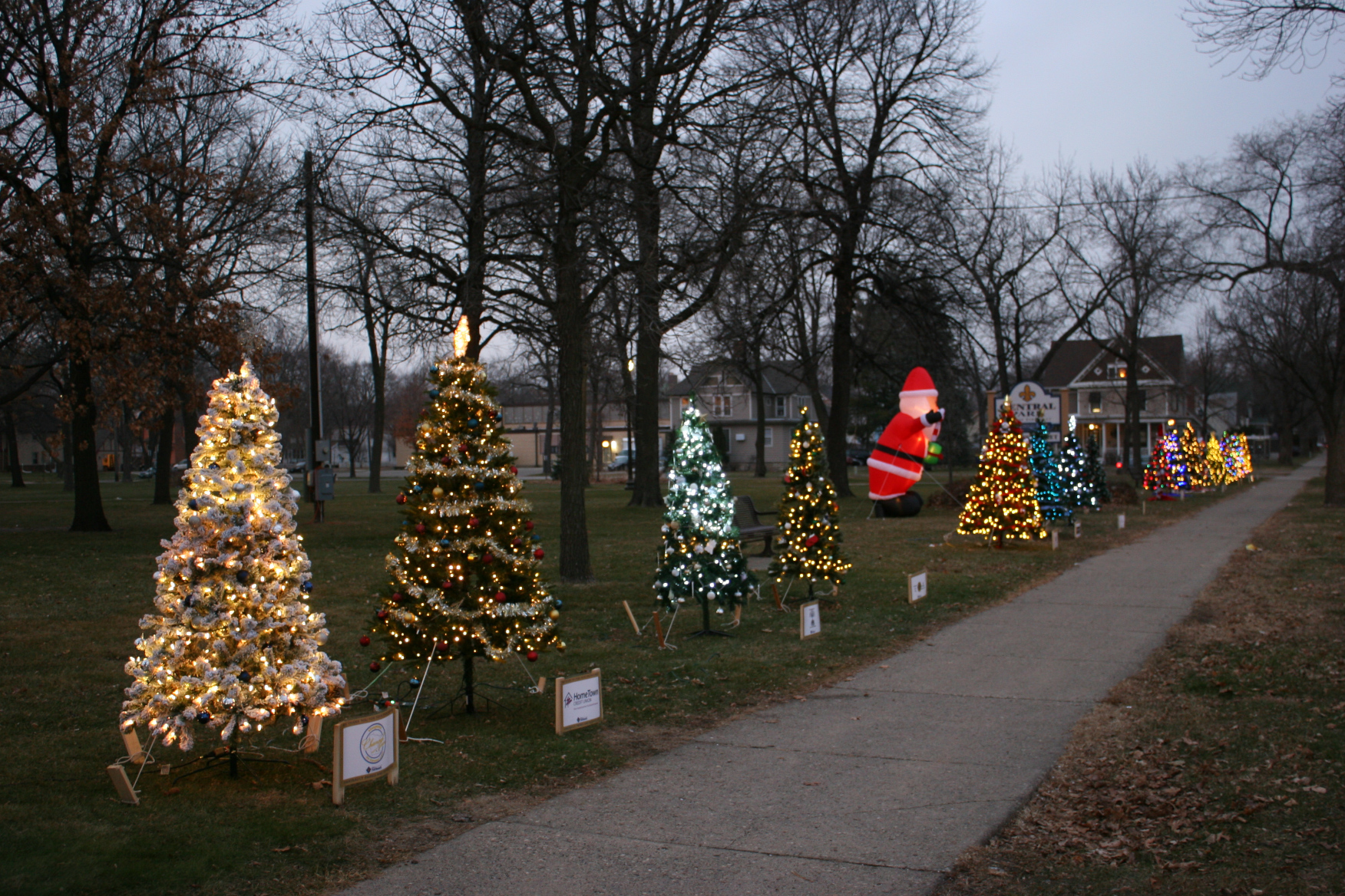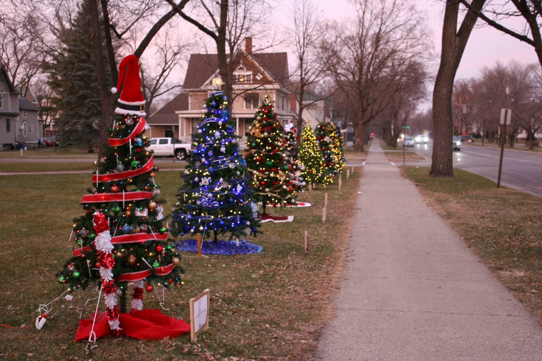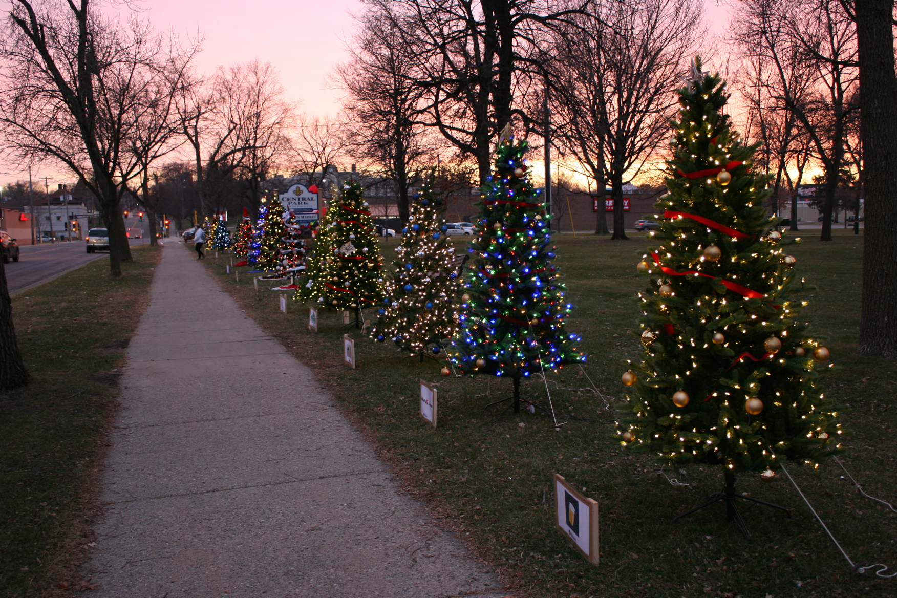 Decorated trees line the sidewalk in Faribault’s Central Park.