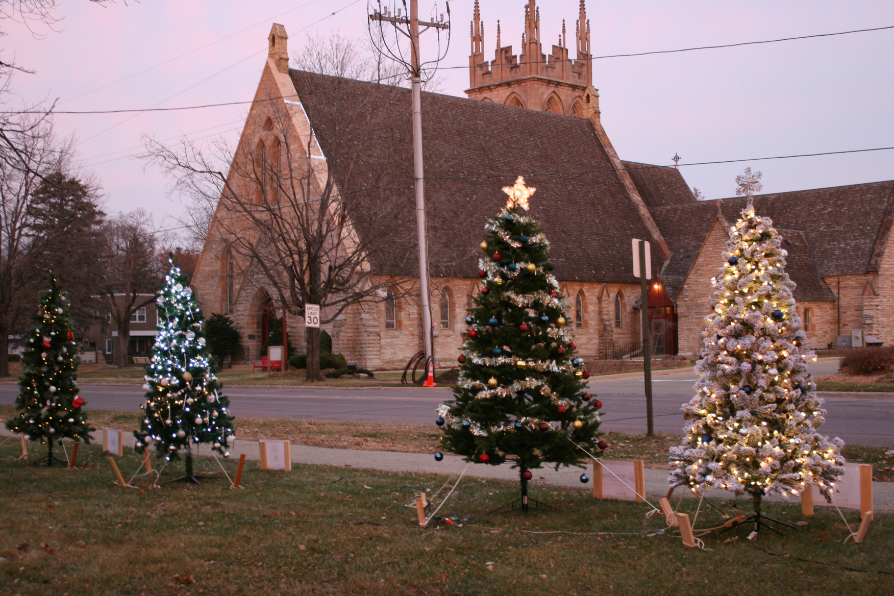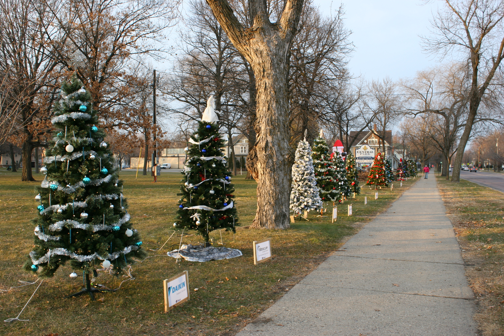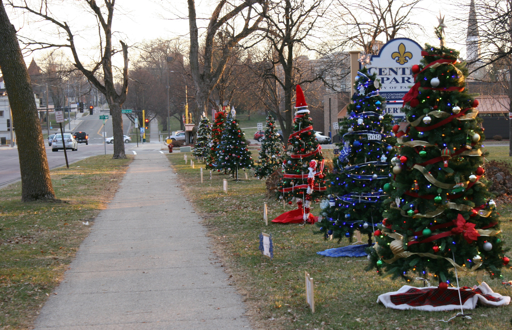Decorated trees line the sidewalk in Faribault’s Central Park.