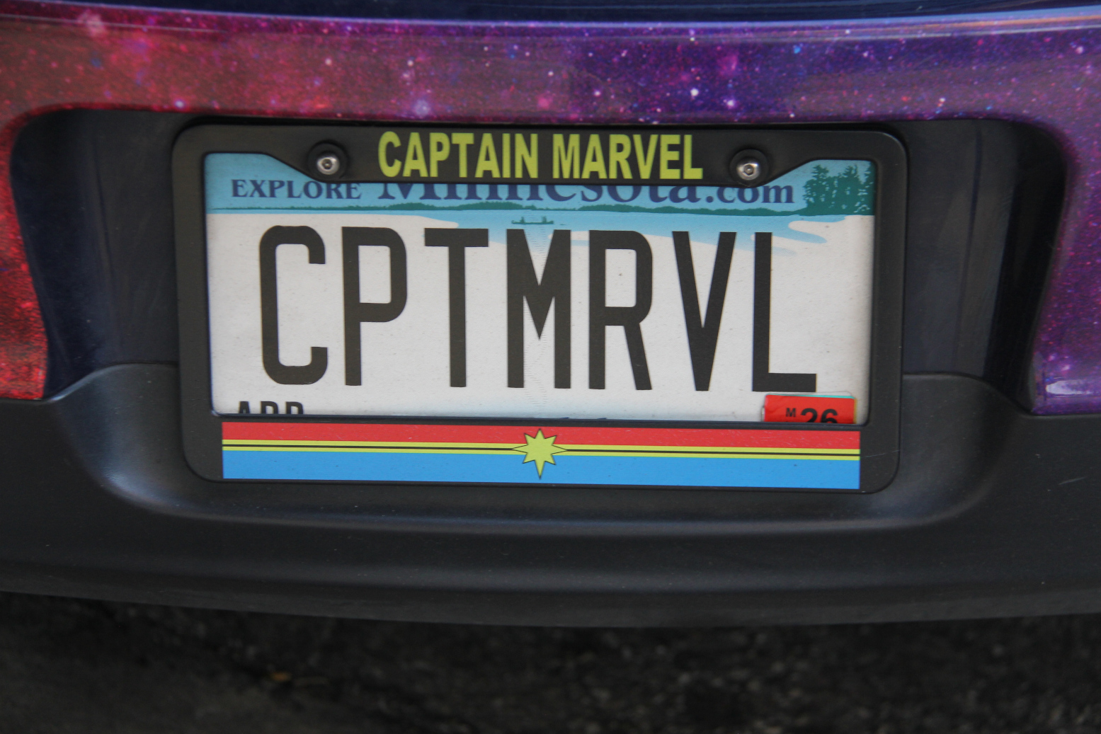 Sometimes superheroes inspire as seen on a flashy purple car parked at a downtown Faribault Car Cruise Night this summer. Captain Marvel themed the car. The Minnesota license plate, CPTMRVL, did not escape my notice. This car owner clearly identifies with the positive superhuman powers of Captain Marvel.
