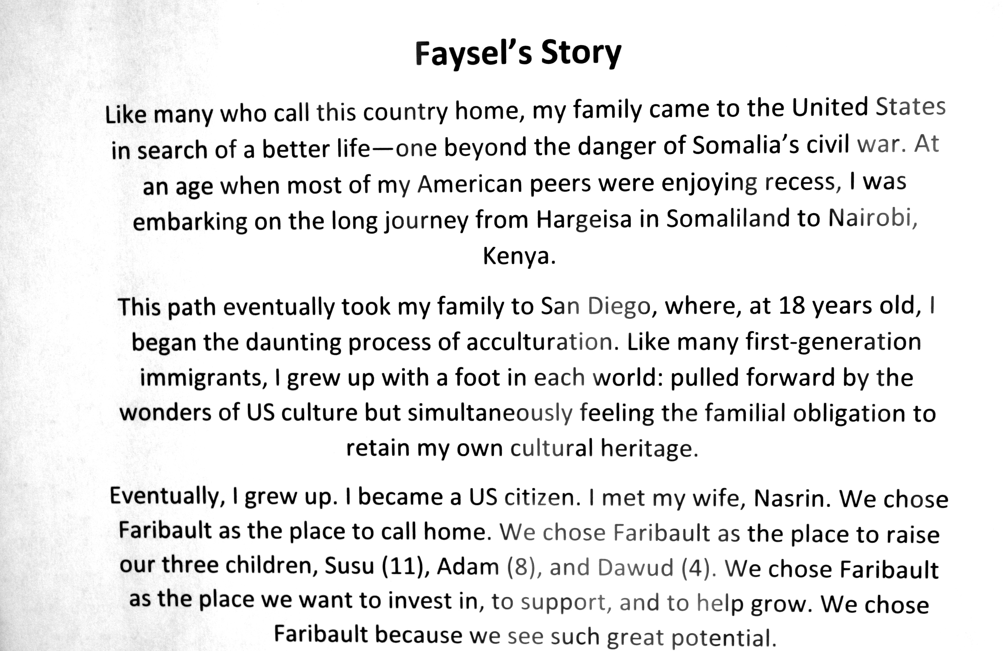 Langlais’ inclusion of the anonymous mother’s portrait and story, along with Brown’s photo and words, is perhaps the most important part of the “I Am Minnesota” exhibit. And to think, I nearly missed it there in a corner of the gallery. Don’t miss this exhibit, which closes on November 15 at the Paradise Center for the Arts. It’s located in historic downtown Faribault, a place many immigrants call home.
